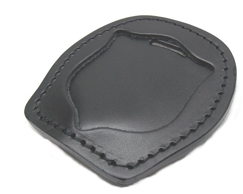 Porta placca da cintura in cuoio con molla in polimero per placca Polizia di Stato, modello Vega e similari. Placca non inclusa. Diametro esterno 8 cm. Peso lordo: 58 grammi. Prodotto in Italia.
