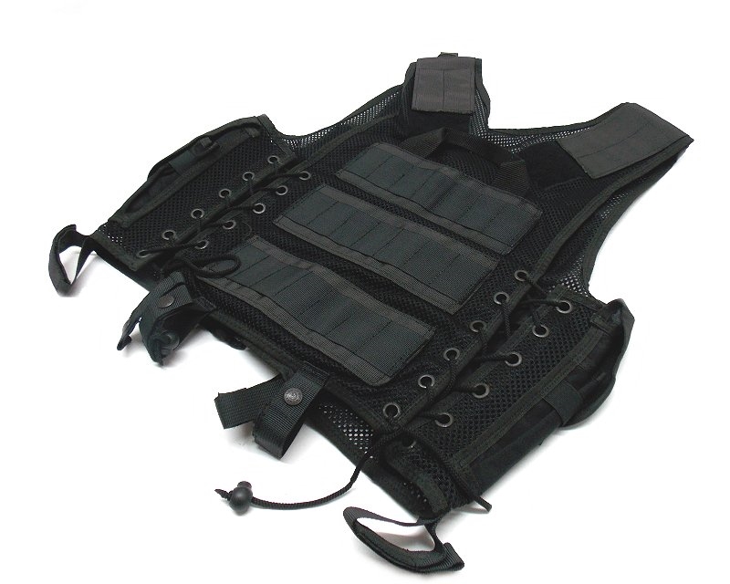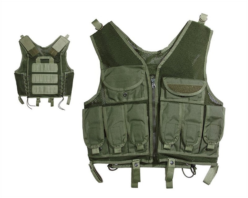 Gilet tattico in rete traspirante e cordura. Con sei portacaricatori, tasca porta cartucce, tasca supplementare, tasca spalla e doppia tasca interna larga capacita. Regolabile sulle spalle e lateralmente, lacci di fermo al cinturone. Sul retro nastri per inserimento accessori vari. Predisposto per inserimento della borraccia di idratazione militare. Disponibile verde e nero. Peso lordo: 1340 grammi.
