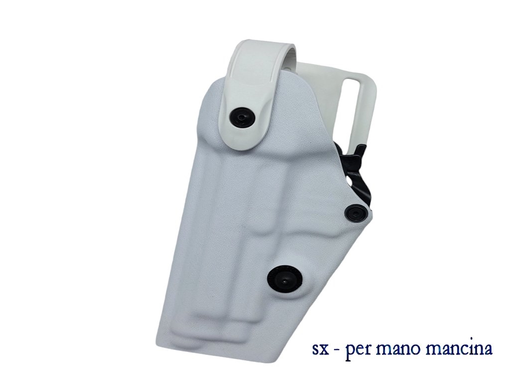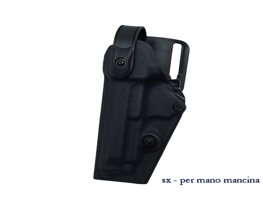 Foderata internamente per una maggiore silenziosità e protezione dell'arma. Triplo sistema di sicurezza: sistema di sicurezza superiore manuale e doppio sistema di sicurezza automatico e manuale sul ponticello. Vite di ritenzione sulla canna. Dotata di passante girevole che inclina la fondina fino a 90°. Fondina adatta per uso professionale in divisa o tattico che consente all'operatore la possibilità di poter mettere al sicuro la propria arma durante le situazioni di particolare pericolo come risse, operazioni di rivolta, in ambito di manifestazioni o eventi sportivi etc..con l'opportunità di sbloccare una alla volta i sistemi di sicurezza, rendendo l'arma più sicura ma al tempo stesso pronta per l'uso grazie alla facilità di sbloccaggio. Disponibile per le seguenti armi: Beretta 92, Beretta 84, Beretta Px4,Glock, Sig Sauer 2022, Walther P99, h&k. Fondina in termoformatura. Prodotto in Italia. Peso lordo: 400 grammi.