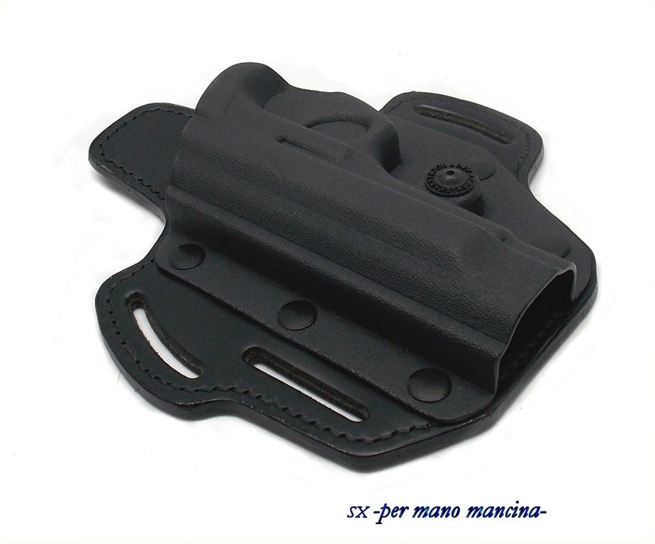 Corpo fondina in polimero per una maggiore resistenza e precisione nel contenere l arma, parte inferiore in pelle naturale per un maggiore confort sul fianco. Ritenzione per sformatura del ponticello. Prodotta per le seguenti armi: beretta 92, px4, sig sauer 2022, h&k usp compact, glock 19, 22, 17, 23, 25, 38, colt 1911. Colore nero. Le tre asole sono per cinture alte 4 cm. Prodotto in Italia. Peso lordo: 200 grammi.