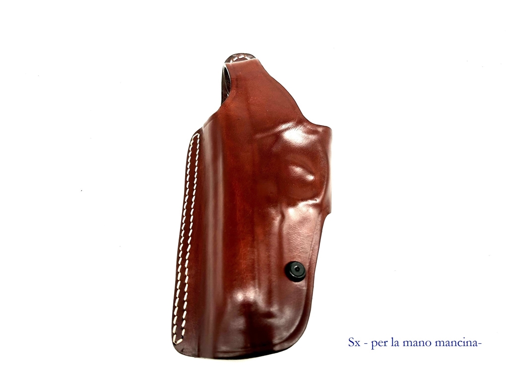 Fondina da cintura biuso: dietroschiena orizzontale o verticale con la canna rivolta verso il basso. Fondina in cuoio ingrassato marrone e nero. Prodotta per: Beretta 92, 98, 98A1, apx, px4 storm, 81, 84, 8000, 9000, caracal f, caracal c, cz75, glock 17, 19, 20, 21, 22, 23, 25, 26, 27, 29, 30, 36, 42, sig sauer pro 2022, hk usp compact, taurus g3, walter ppk, pps, ppq, p99q, p99. Le asole del passante sono per cinture alte 4 cm. Peso lordo. 150 grammi. Prodotto in Italia.