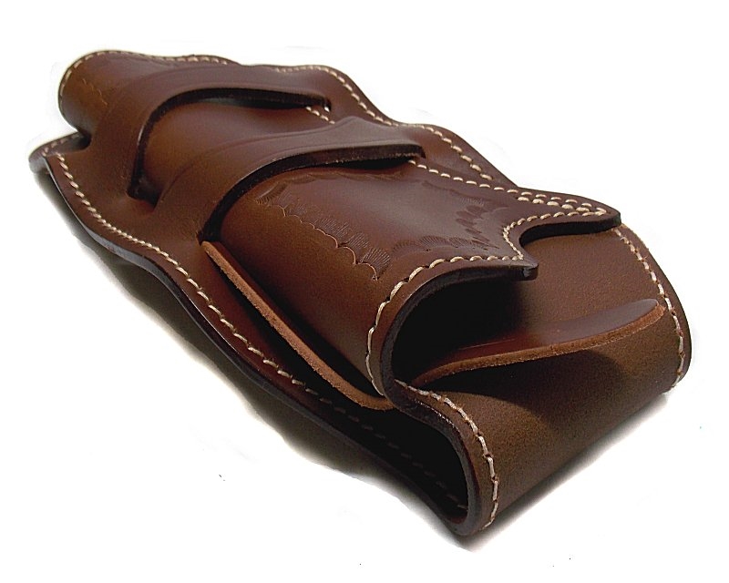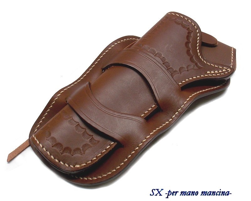 Fondina western ad estrazione trasversale al fianco, in cuoio ingrassato marrone, per revolver 6,5 pollici singola azione. Disponibile destra o sinistra. Peso lordo: 290 grammi. Prodotto in Italia.