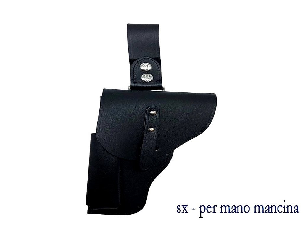 Fondina in cuoio con pattina. Prolunga passante con 2 bottoni. Porta caricatore. Colore disponibile: nero e bianco. Disponibile per le seguenti armi: Beretta 81, 84, 85. Altezza ideale della cintura per poter essere adattata al meglio la fondina è 4 cm. Peso lordo: 225 grammi. Prodotto in Italia.