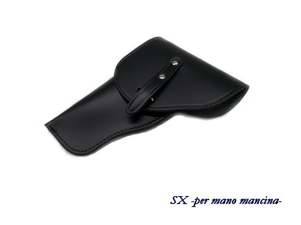 Fondina chiusa in pelle con passante fisso. Prodotta per le seguenti armi: medium auto (Beretta 84f), large auto (Beretta 92 o 98, glock 17, 19, tanfoglio force), large auto compact (cougar 8000, px4 e similari). Colori disponibili: nero o bianco. Peso lordo: 140 grammi. Prodotto in Italia.