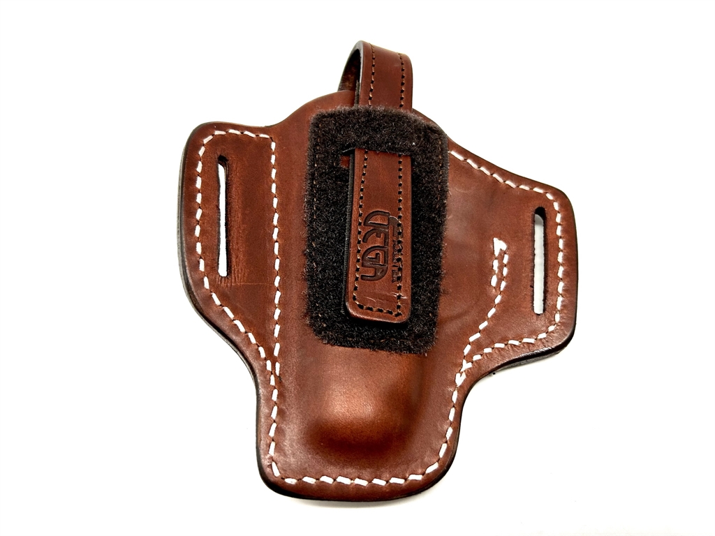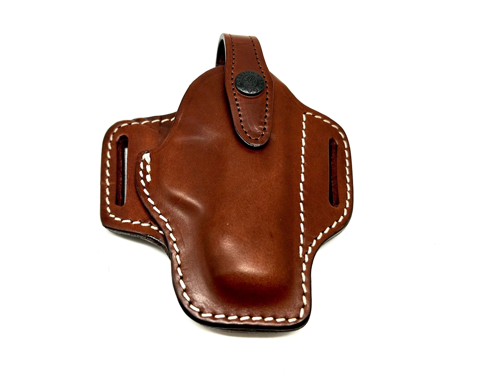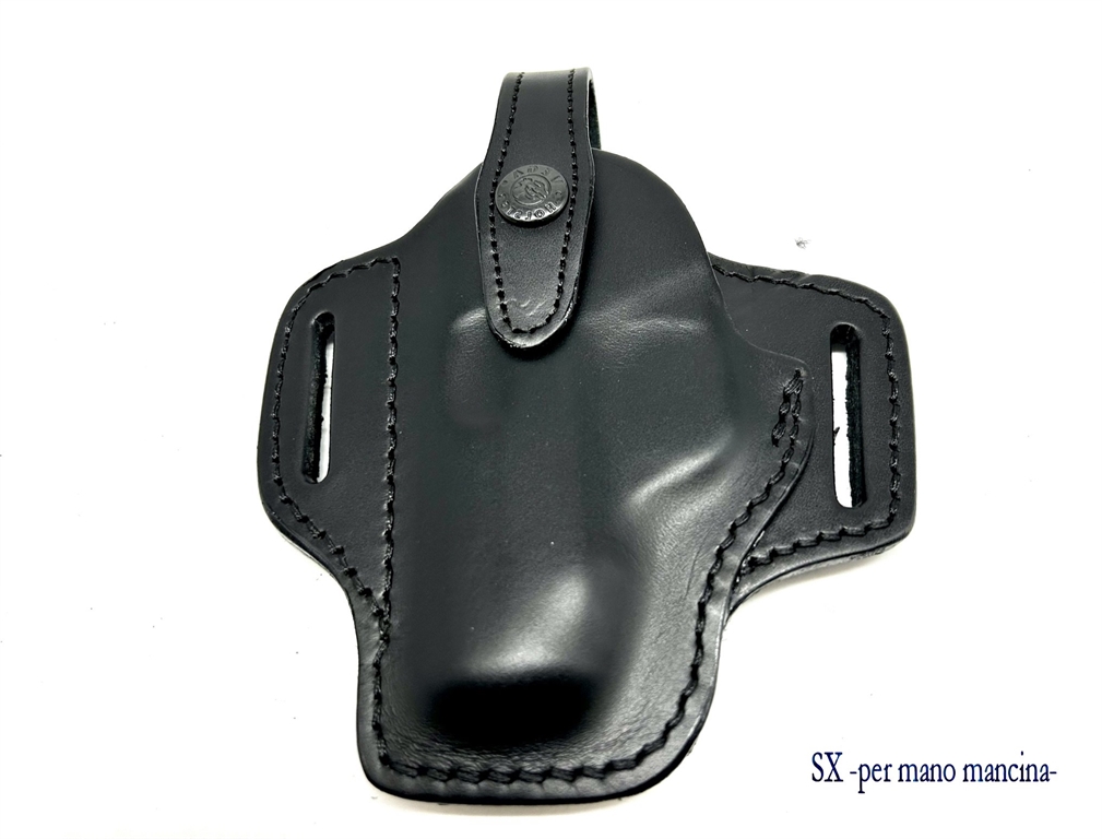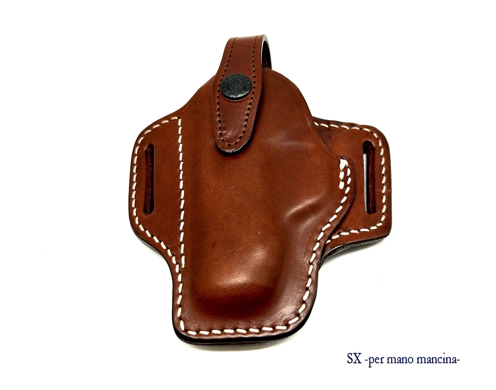 Fondina da cintura con doppia asola, con laccino regolabile in cuoio ingrassato marrone o nero, per pistole automatiche di piccolo calibro. Altezza interno fondina cm 12 e larghezza massima interna utilizzabile cm 6. Peso lordo: 100 grammi. Prodotto in Italia.