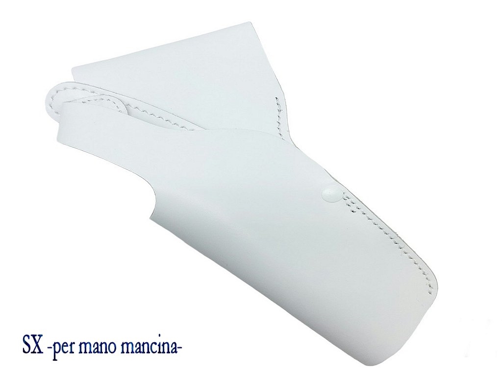 Fondina in cuoio ad estrazione rapida, passante per cinturone. Realizzata senza sformatura a fuoco dell arma. Disponibile in colore bianco per: beretta 92 o 98 o similari. Altezza ideale della cintura per poter essere adattata al meglio la fondina e 5 cm. Peso lordo: 170 grammi. Prodotto in Italia.
