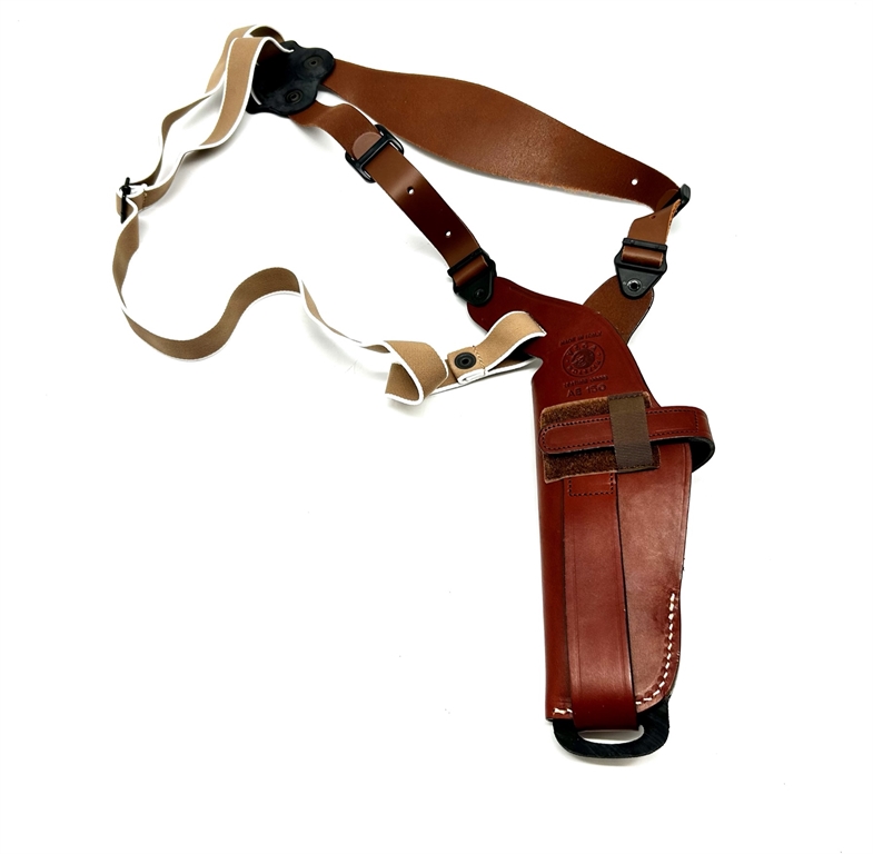 Fondina ascellare verticale in cuoio marrone foderata internamente in scamosciato con fermo alla cintura e sicura regolabile. La particolare forma ad incrocio tiene la fondina più aderente al corpo. Fondina adatta per: Beretta 90two, 98a1, px4 storm, 92, 96, 98, Browing hp, Colt 1911, Cz 75sp, H&K USP, Glock 17, 20, 21, Sig Sauer P220, P226, Tanfoglio force. Peso lordo: 275 grammi. Prodotto in Italia.