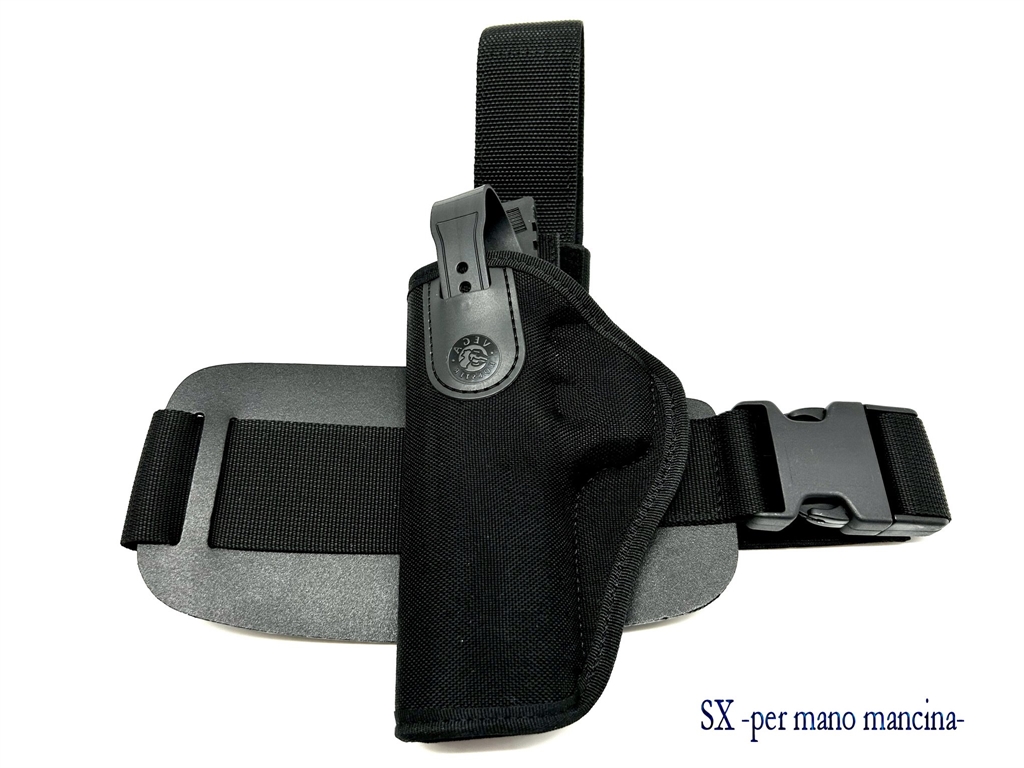 Fondina in cordura balistica nera sagomata, con attacco alla coscia e tenuta cintura, regolabile. Prodotta per: beretta 92, 98, 84, 8000, GLOCK 17, 19, 20, 22, 23, 25, 32, 38, hk usp compact, revolver 4 pollici, sig sauer p228, p229, walther p99. Peso lordo: 260 grammi. Prodotto in Italia.