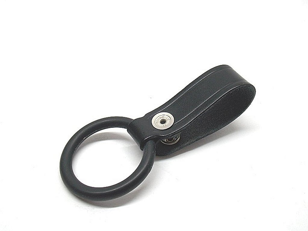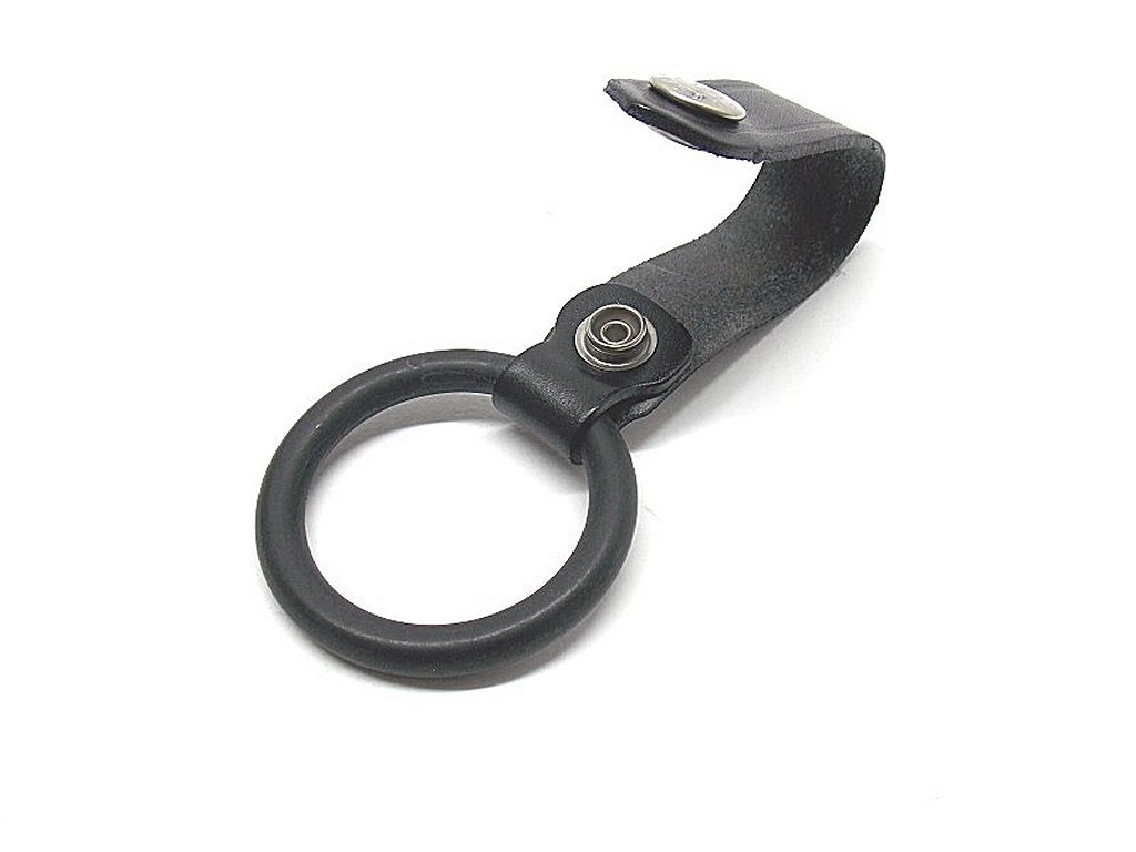 Porta torcia in pelle con anello in polimero. Passante con bottone apribile per cinturoni alti 5 cm. Diametro interno anello 4,5 cm. Peso lordo: 27 grammi. Prodotto in Italia.