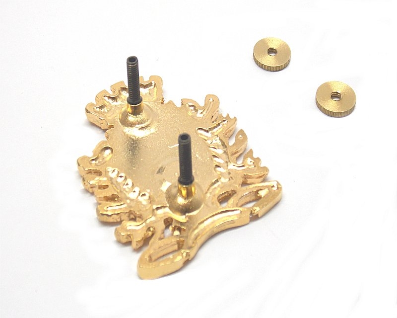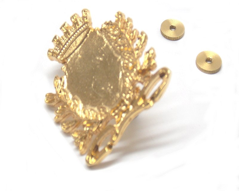 Dimensioni esterne: lunghezza 5 cm, larghezza 4 cm. Dimensioni base interna: lunghezza 3 cm, larghezza 2 cm. Fregio con due viti complete di dato tornito. Peso lordo: 15 grammi.