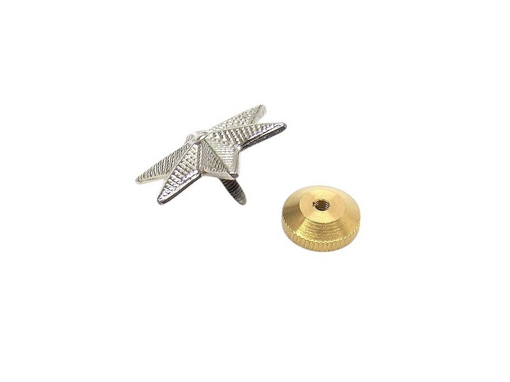Stella argentata a sei punte con vite in metallo zigrinato leggermente bombato. Diametro massimo: 21 mm. Peso lordo: 1 grammo.