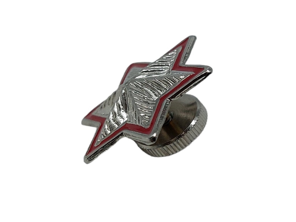 Stella argentata bordata di rosso a sei punte con vite in metallo zigrinato leggermente bombato. Diametro massimo: 21 mm. Peso lordo: 1 grammo.