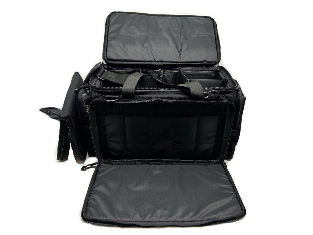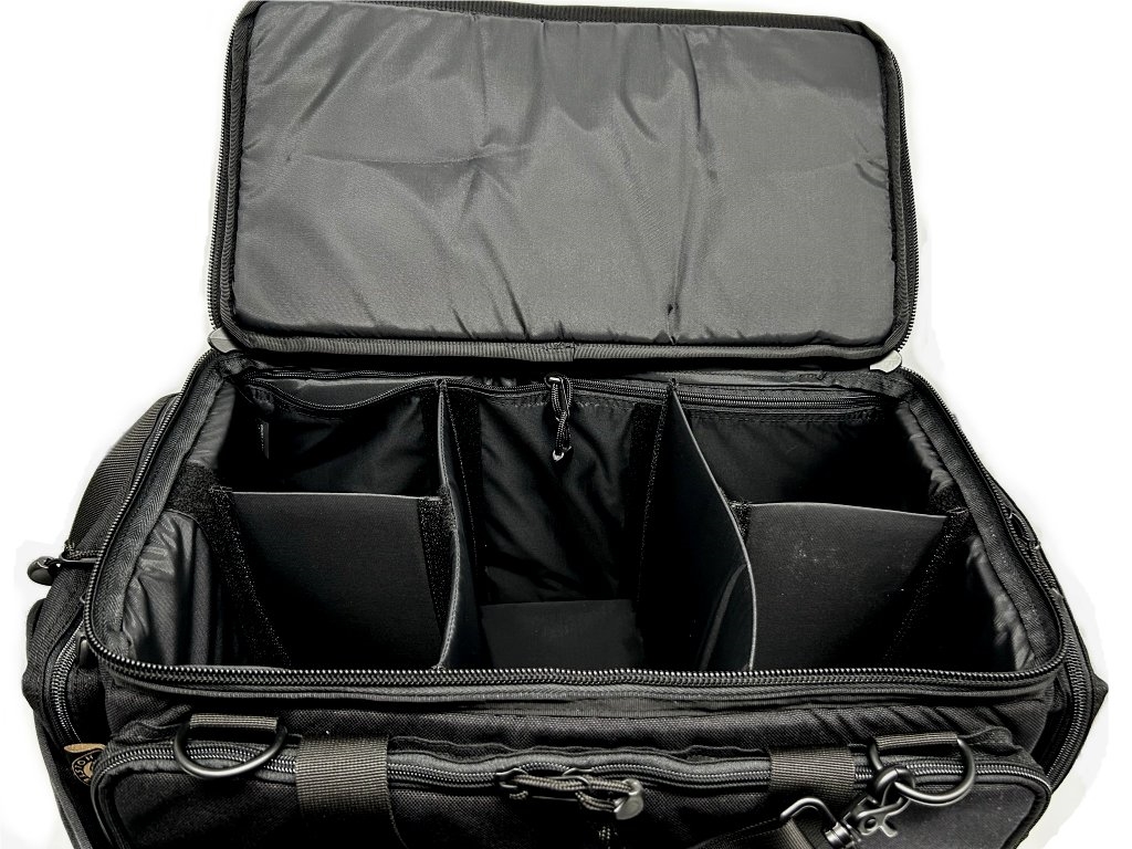 Borsone con tracolla imbottito con 4 tasche esterne, due borsetti interni porta pistola rettangolari con cerniera asportabili, una tasca esterna ad apertura totale con porta caricatori. Vano centrale con separatori regolabili. Dimensioni: 46x34x30 cm. Peso lordo: 2400 grammi.
