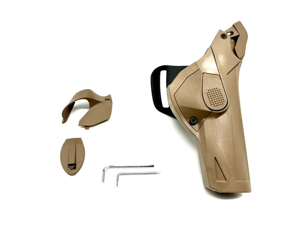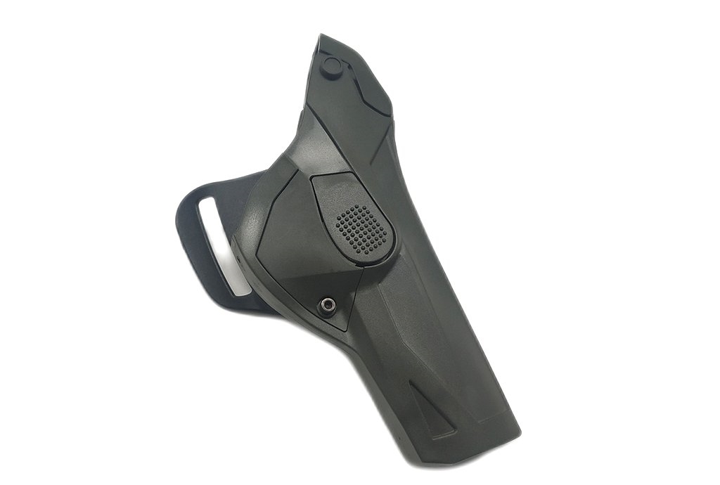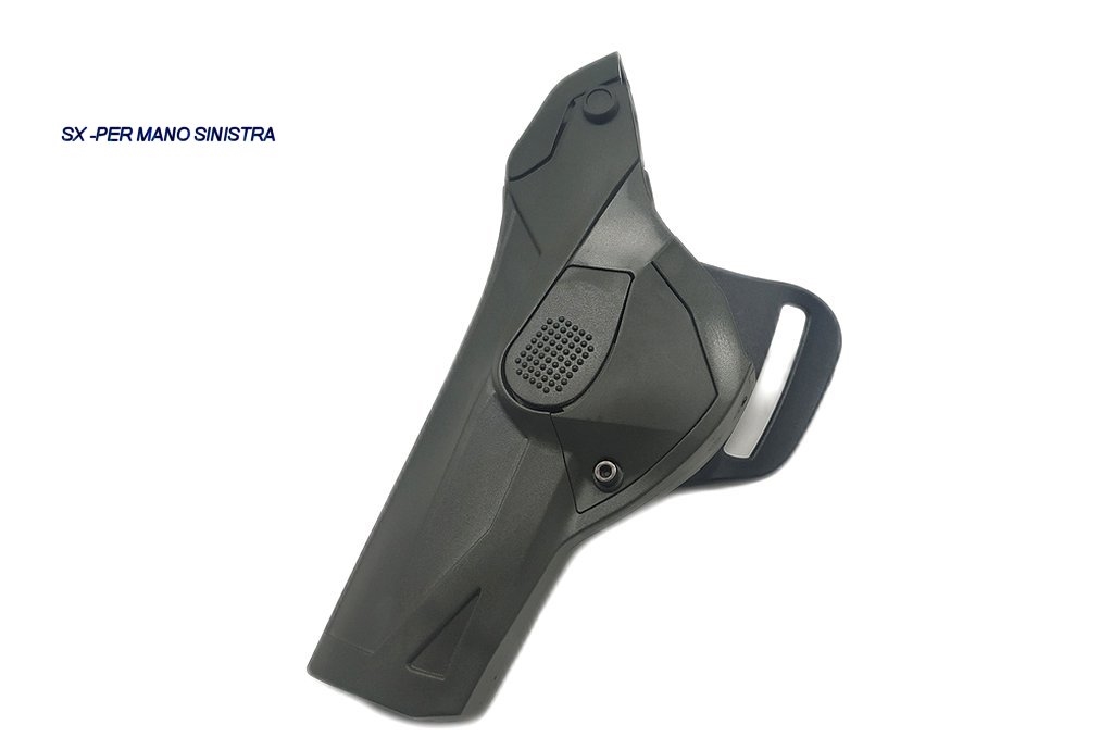 Fondina in polimero con vite di ritenzione. Sicura superiore sganciabile con movimento del pollice. Sicura inferiore sganciabile con movimento dito indice. Possibilità di chiusura apertura inferiore. Possibilità di inserimento copertura totale sicura anteriore. Le asole del passante sono per cinturoni alti 5,5 cm. Colori disponibili: nero, verde, desert. La fondina di colore desert ha il passante di colore nero. Possibilità di montaggio su tutti i passanti e kit Vega. Brevetto internazionale. Disponibile per le seguenti armi: Beretta 92/98, APX, Glock 17/18/22/31/37, Glock 19/23/25/32/38. Prodotto in Italia. Peso lordo: 340 grammi.