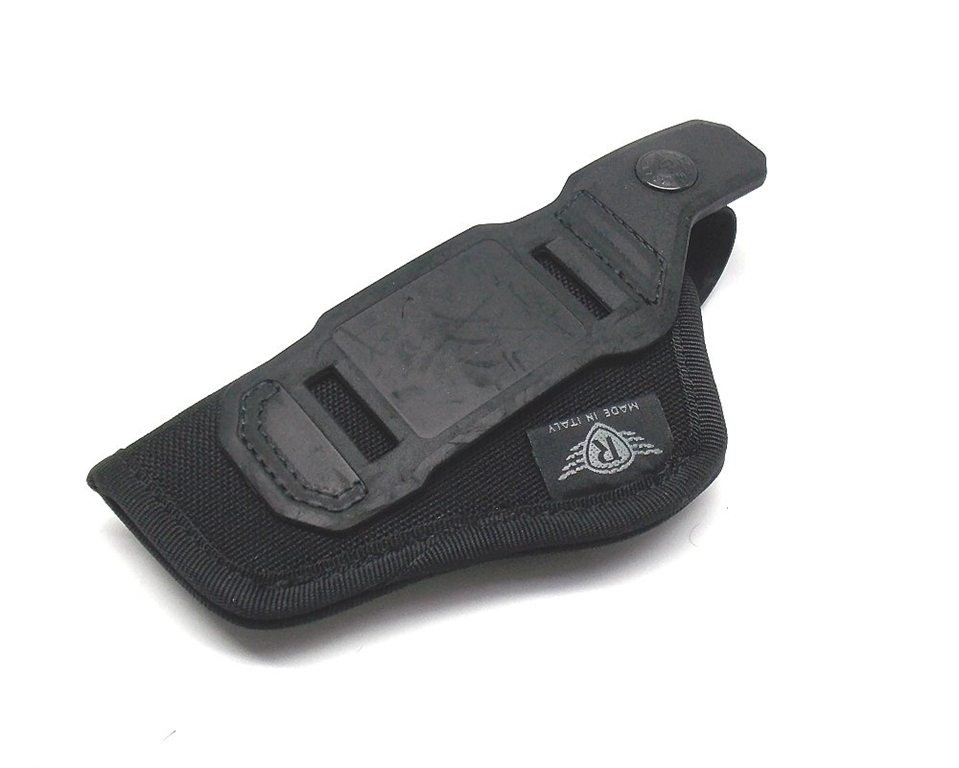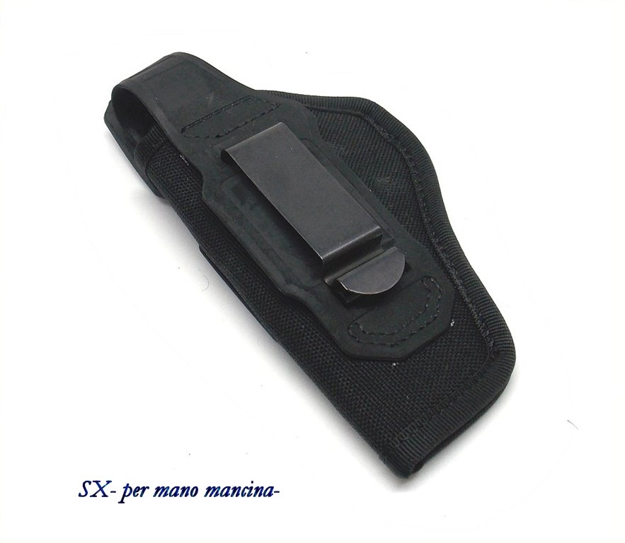 Fondina interna ed esterna con chiusura superiore e con molla in metallo applicabile ambo i lati. Passante per cintura, ambo i lati, in cuoio alto 5,5 cm. Colore nero. Disponibile destra o sinistra. Prodotto in Italia. Peso lordo: 95 grammi.