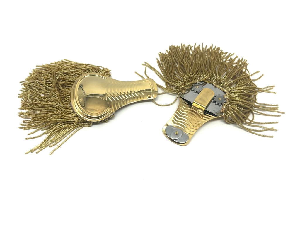 Coppia spalline in metallo con frange dorate in canottiglia per grande uniforme. Lunghezza 14 cm. Larghezza max 10 cm. Larghezza minima 4,5 cm. Peso lordo: 410 grammi.