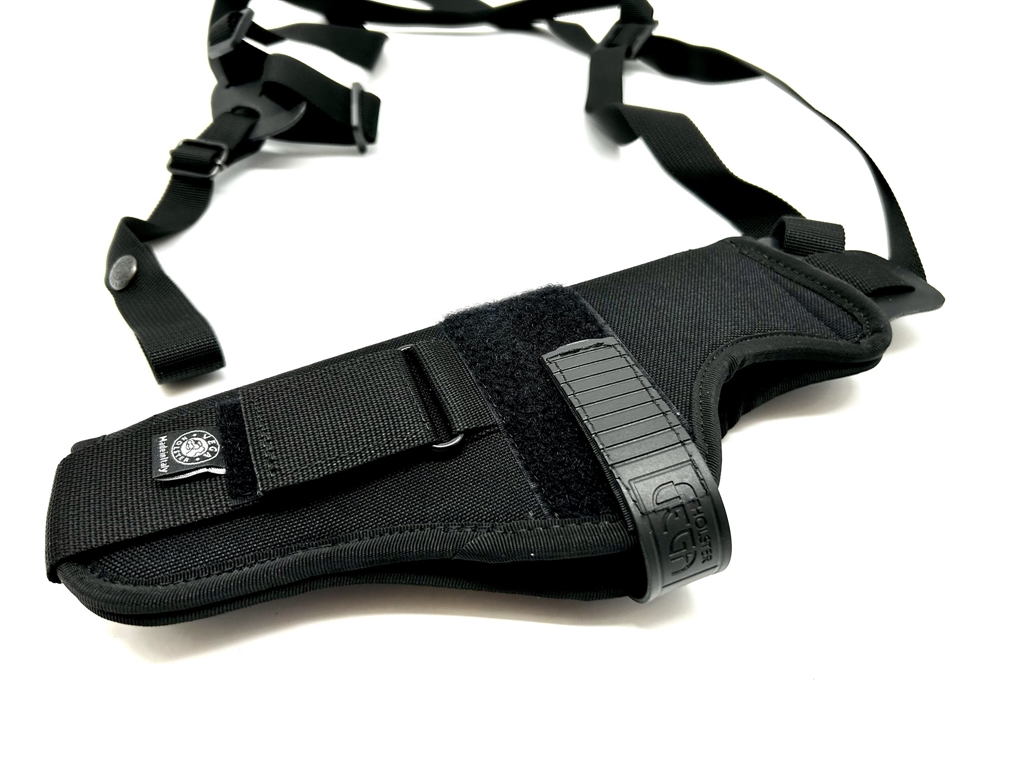 Fondina ascellare verticale ambidestra in cordura foderata, sistema ascellare con aggancio alla cintura e sgancio regolabile. Disponibile per large auto, medium auto, large auto compact e revolver da 2 a 6 pollici. Colore disponibile: nero. Peso lordo: 220 grammi. Prodotto in Italia.