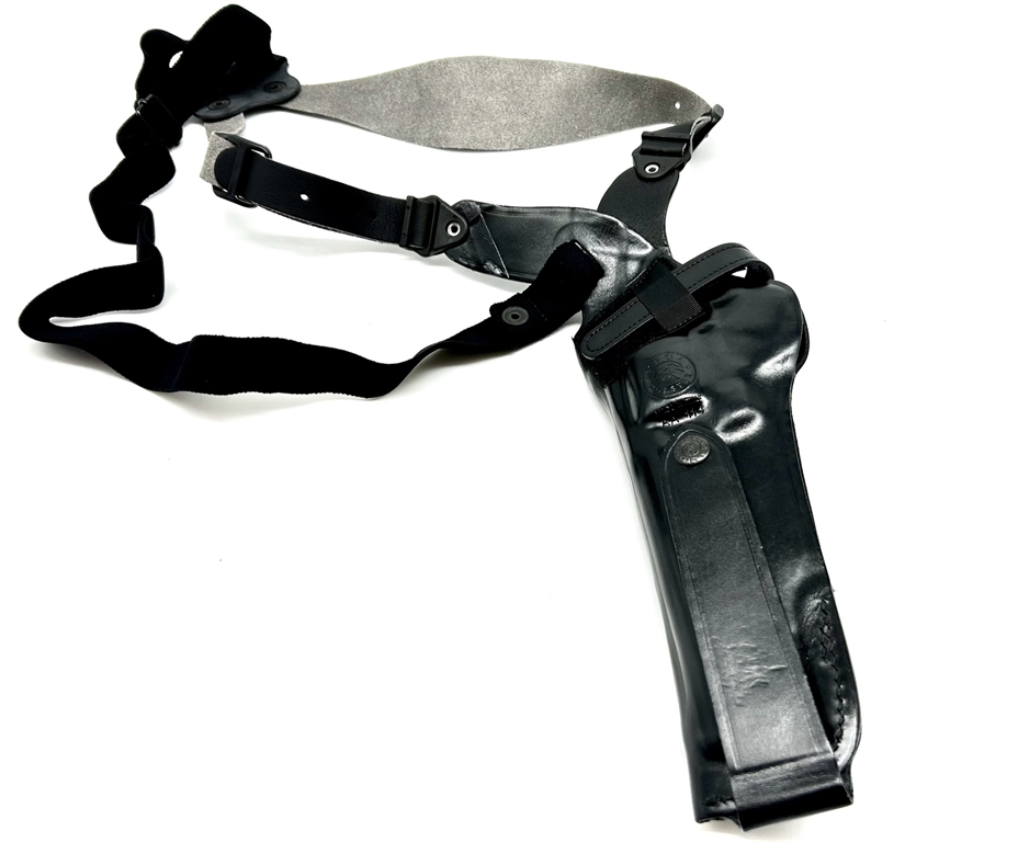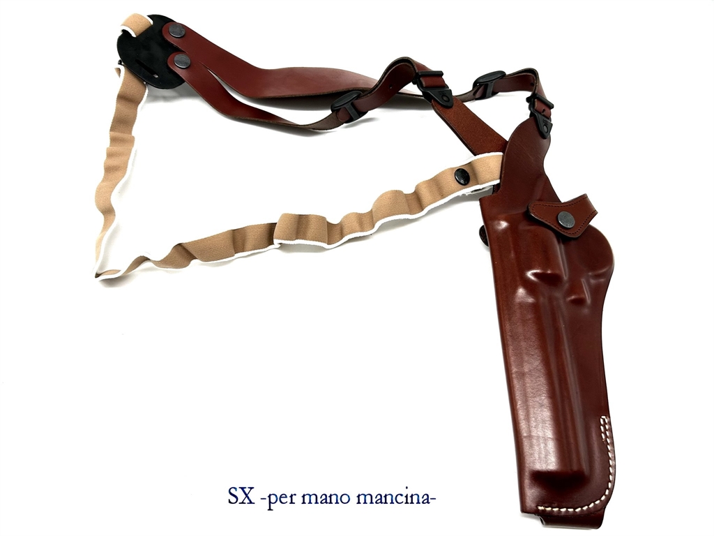 Fondina ascellare verticale in cuoio sformato con sgancio rapido. Disponibile nei colori nero o marrone. Prodotta per Beretta 92, 98, 81, 82, 84, 85, 90 two, 98 A1, px4 storm, 8000, 9000, colt 1911, glock 17, 19, 20, 21, 22, 23, 25, 26, 27, 28, 29, 30, 36, 31, 32, 36, 37, hk usp, walther p99, ppq, p99q, revolver 2,5, 4 e 6 pollici. Peso lordo: 295 grammi. Prodotto in Italia.
