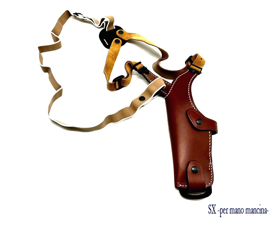 Fondina ascellare verticale in cuoio marrone foderata internamente in scamosciato con fermo alla cintura e sicura regolabile. La particolare forma ad incrocio tiene la fondina più aderente al corpo. Fondina adatta per: Beretta 8000, 9000, Colt commander, Glock 19, 23, 25, 32, 38, Sig Sauer P225, 228, 229, 250, Pro 2022, Tanfoglio carry, Walter pps, ppq, p99q, p99. Peso lordo: 340 grammi. Prodotto in Italia.