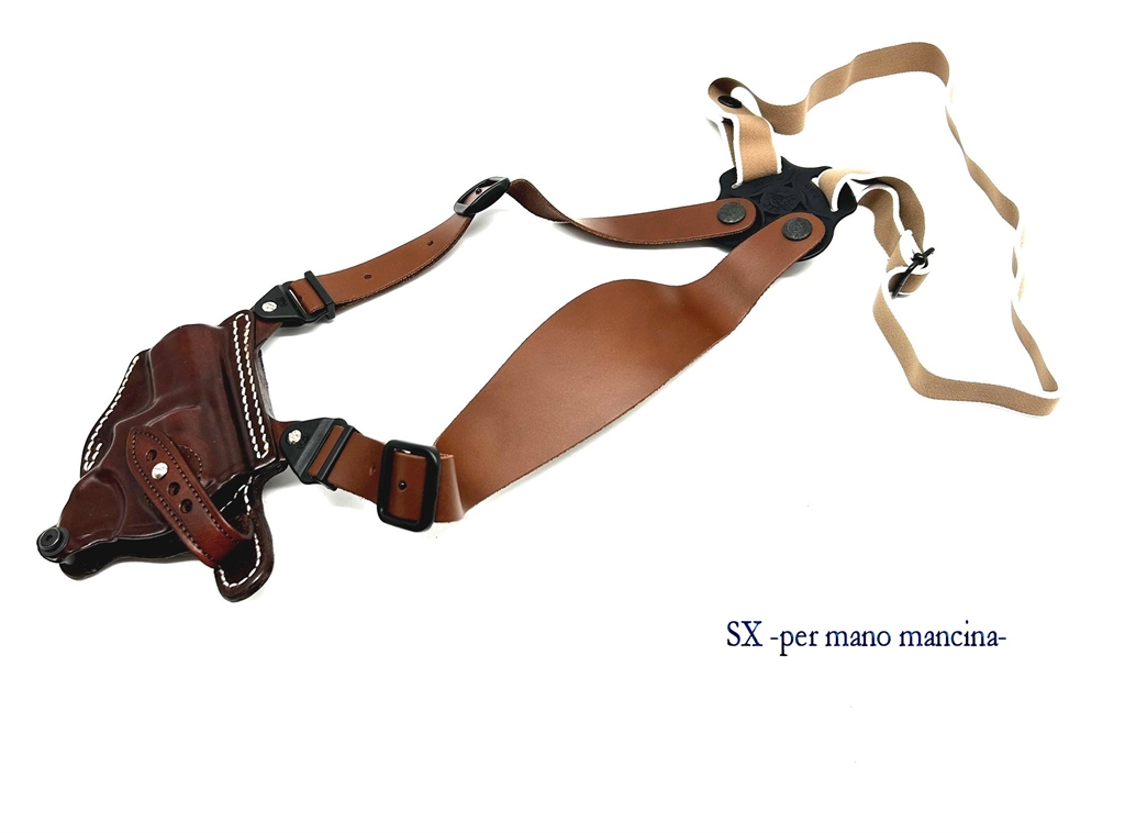 Fondina in cuoio ascellare o da cintura con sgancio rapido. 4 usi: ascellare orizzontale, a cintura sul fianco destro, cross draw e retroschiena. Prodotta per: Beretta 92, 98, 84, 9000, Beretta apx, px4 storm, 90 two, 98 A1, colt 1911, caracal c, caracal f, glock 17, 19, 20, 22, 23, 26, 27, 30, 42, revolver da 2 fino a 4 pollici, sig sauer p226, 228, 229, 230, 232, 2340, pro 2022, hk usp, spriengfield xd, walther p99, ppk, pps. Disponibile nei colori marrone o nero. Peso lordo: 210 grammi. Prodotto in Italia.