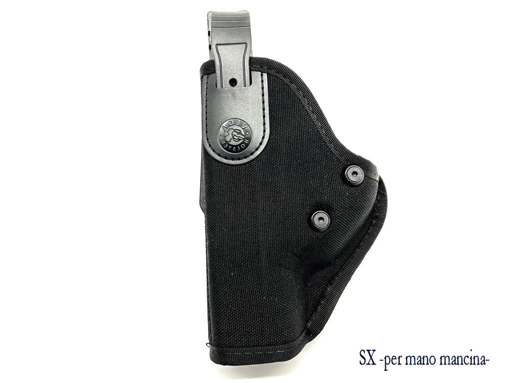 Fondina per uso in divisa. Triplo sistema di sicurezza: pull side automatico e sgancio rapidi, passante per cintura in polimero con tripla inclinazione. P rodotta per le seguenti armi: beretta 92, 96, 98, px4 storm, glock 17, 19, 22, 23, 25, 31, 32, 37, 38, h&k usp compact, p2000, sig sauer pro 2022, p228, p229, sprinengfield xd, taurus pt 92 ,99, 100, 101, walther p99. Le asole del passante sono per cinturoni alti 5 cm. Peso lordo: 265 grammi. Prodotto in Italia.
