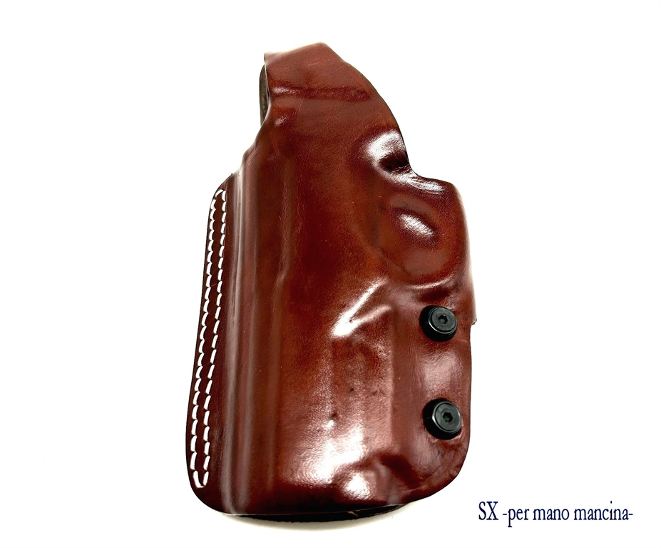 Fondina da cintura biuso: dietroschiena orizzontale o verticale con la canna rivolta verso il basso. Fondina in cuoio ingrassato marrone o nero. Prodotta per: beretta 92, 98, 98A1,APX, px4 storm, 81, 84, 8000, 9000, caracal f, caracal c, cz75, glock 17, 19, 20, 21, 22, 23, 25, 26, 27, 29, 30, 36, 42, sig sauer pro 2022, hk usp compact, taurus g3, walter ppk, pps, ppq, p99q, p99. Le asole del passante sono per cinture alte 4 cm. Prodotto in Italia. Peso lordo: 145 grammi.