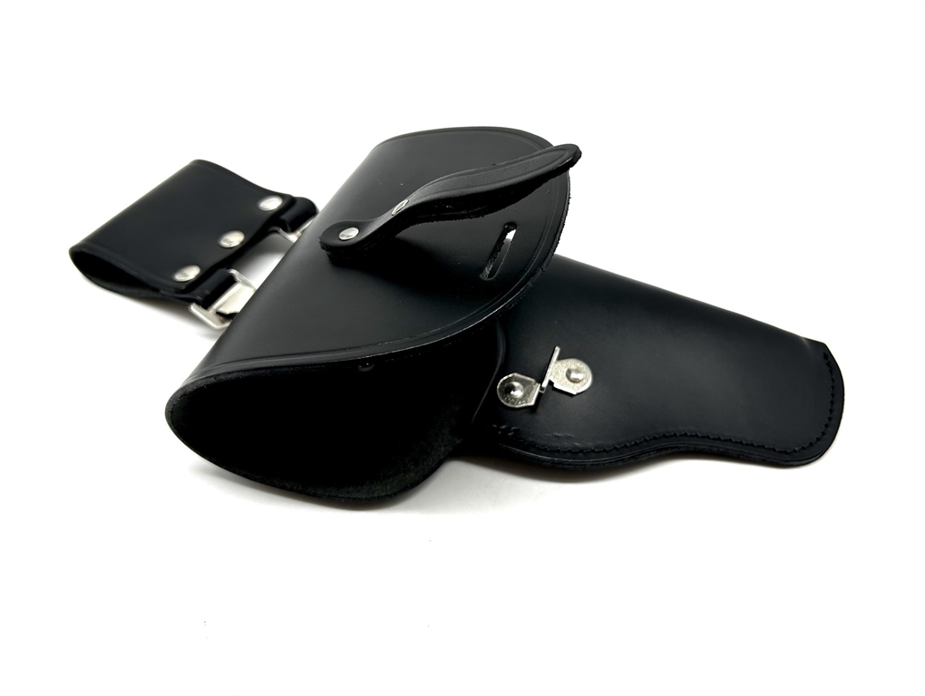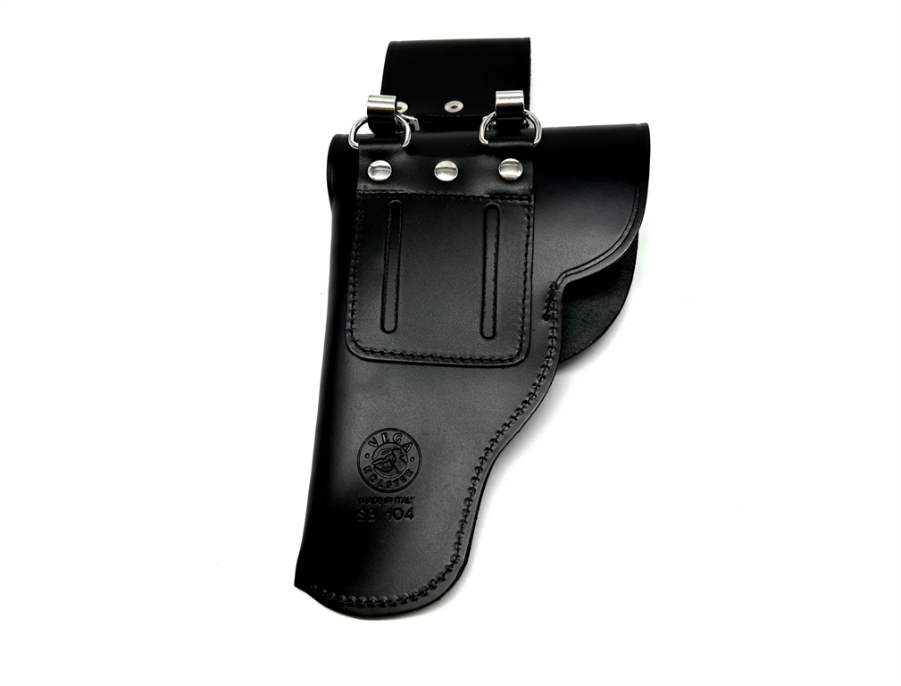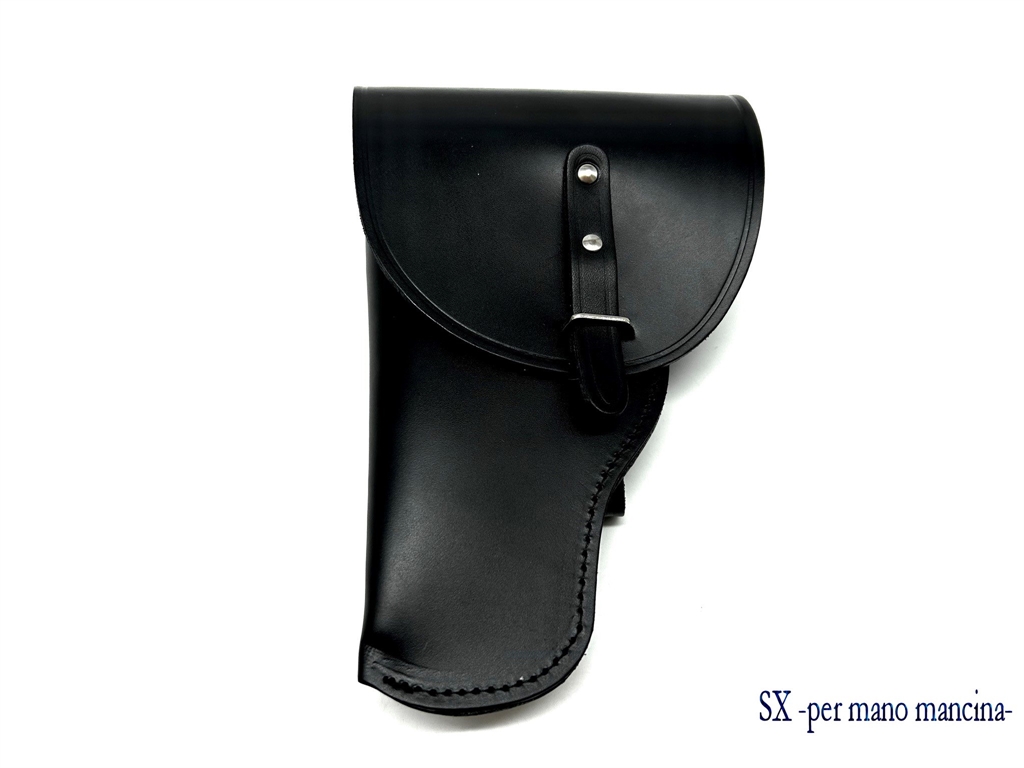 Fondina in cuoio con pattina. Doppio moschettone e passante. Colore disponibile: nero o bianco. Prodotta per le seguenti armi: beretta 92/98, 81, 84, 8000 glock 17, 19. 22, 23, 29, tanfoglio gt21, taurus pt92, walther p99. Prodotto in Italia. Peso lordo: 255 grammi.