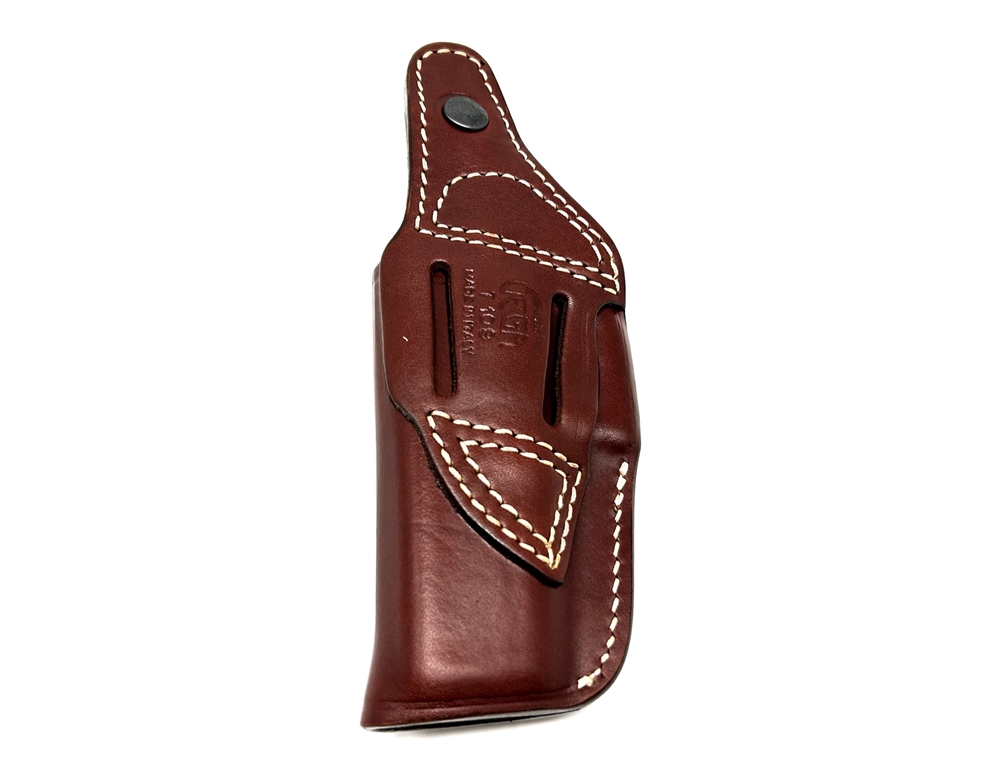 .Fondina da cintura, doppia possibilità di inclinazione: sul fianco destro retta o inclinata. Sformata in cuoio ingrassato marrone o nero. Prodotta per i seguenti modelli: Beretta px4 storm, 92, 98, 84, 8000, 9000, Beretta 70/71, Beretta 6,35 e baby auto, browing hp, colt 1911, revolver da 2 a 6 pollici, glock 17, 19, 20, 21, 22, 23, 25, 26, 27, 28, 29, 30, 32, 33, 36, 37, 38, hk usp compact, sig sauer p 220, 225, 226, taurus pt92, walther ppk, ppq, p99, p99q. Le asole del passante sono per cinture alte 4 cm. Peso lordo: 140 grammi. Prodotto in Italia.