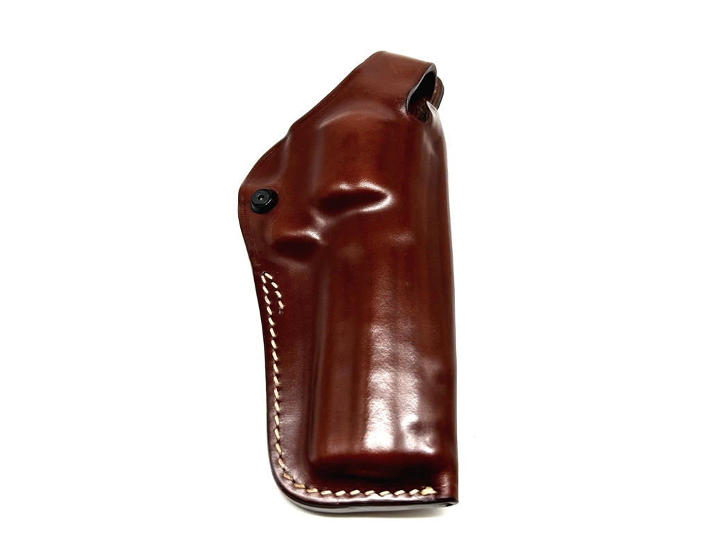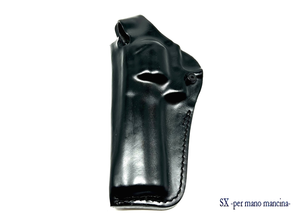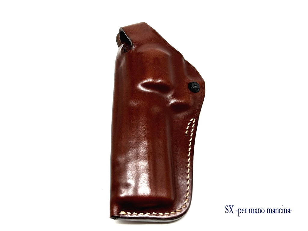 Fondina da cintura, doppia possibilita di inclinazione: sul fianco destro retta o inclinata. Sformata in cuoio ingrassato marrone o nero. Prodotta per i seguenti modelli: beretta px4 storm, 92, 98, 84, 8000, 9000, beretta 70/71, beretta 6,35 e baby auto, browing hp, colt 1911, revolver da 2 a 6 pollici, glock 17, 19, 20, 21, 22, 23, 25, 26, 27, 28, 29, 30, 32, 33, 36, 37, 38, hk usp compact, sig sauer p 220, 225, 226, taurus pt92, walther ppk, ppq, p99, p99q. Le asole del passante sono per cinture alte 4 cm. Peso lordo: 185 grammi. Prodotto in Italia.