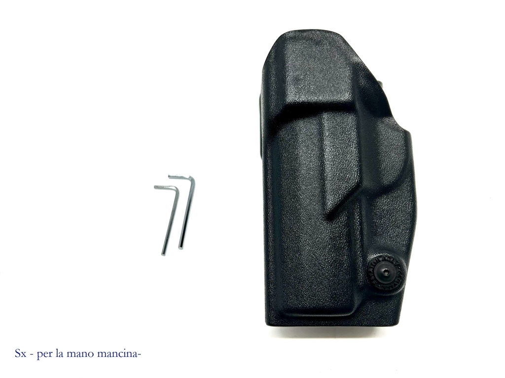 Fondina con un ottimo sistema di sicurezza push down che entra automaticamente all inserimento della arma e si libera con una semplice pressione del pulsante di sblocco. Fondina in polimero termoformato e foderata internamente per una maggiore protezione dell arma. Prodotta per le seguenti armi: beretta 92, 98, px4 storm, glock 17, 18, 19, 22, 23, 25, 31, 32, 37, 38, h&k usp compact, sig sauer pro 2022, taurus pt92, 99, 100, 101. Le asole del passante sono per cinturoni alti 5 cm. Prodotto in Italia. Peso lordo: 320 grammi.