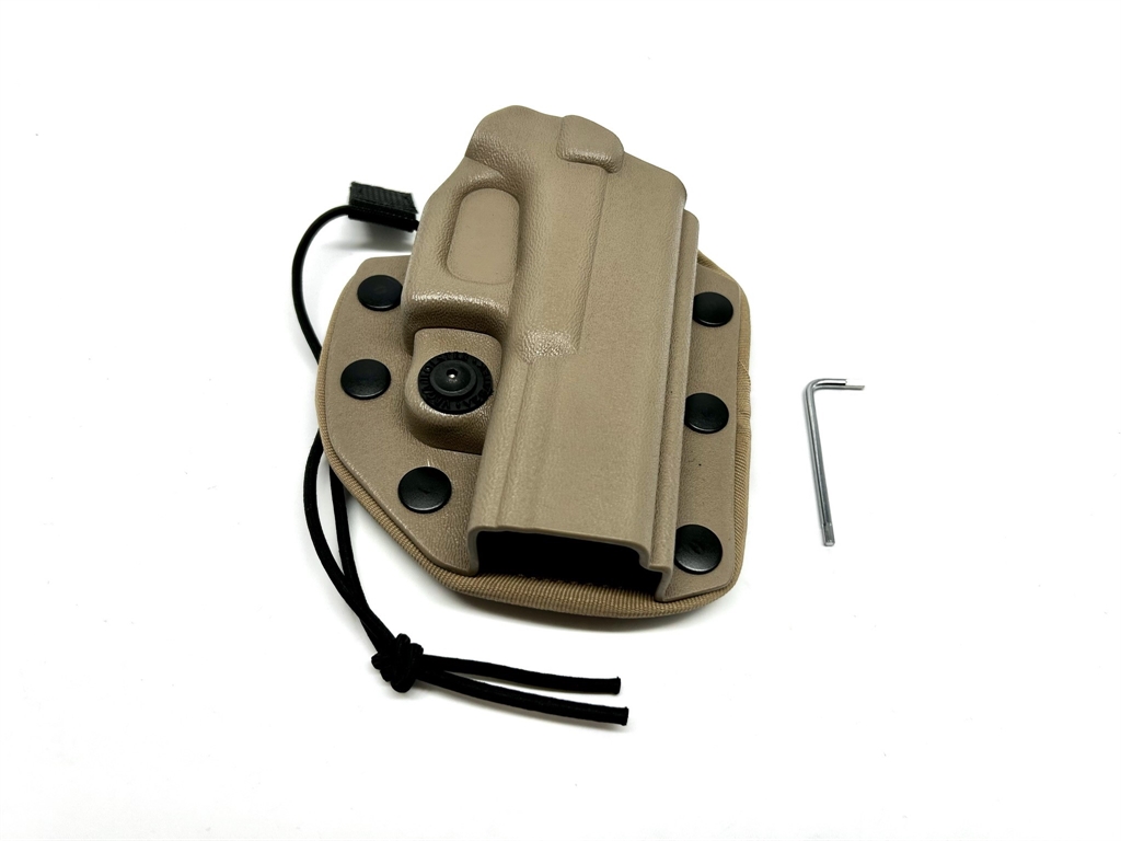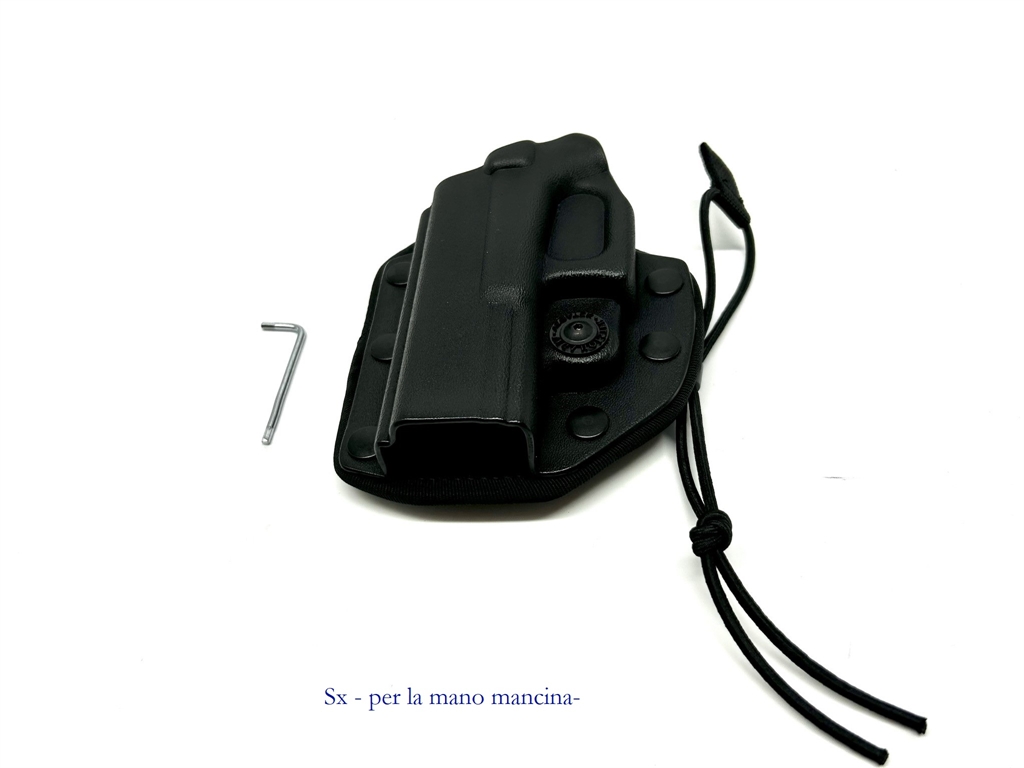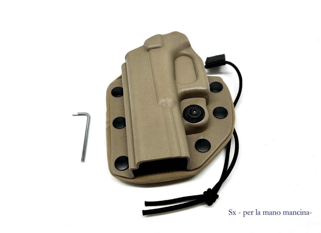 Fondina in polimero termoformato. Sistema di ritenzione tramite frizione sul ponticello e vite di regolazione per la ritenzione dell arma. Piattaforma posteriore in triplice accoppiato polimero, cordura, alveolare con sistema passante tipo molle per l inserimento su piattaforma tattiche o cinture molle compatibili. Colori disponibili: nero, verde, desert. Disponibile per le seguenti armi: beretta 92, 98, px4 storm, glock 17, 18, 19, 22, 23, colt 1911 s, sig auer pro 2022. Due passanti apribili tramite bottoni a pressione. Le asole del passante sono per cinturoni alti sino a 6 cm. Prodotto in Italia. Peso lordo: 140 grammi.
