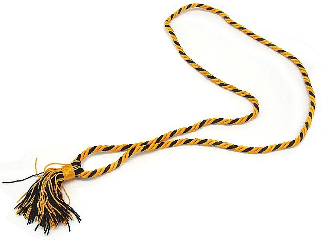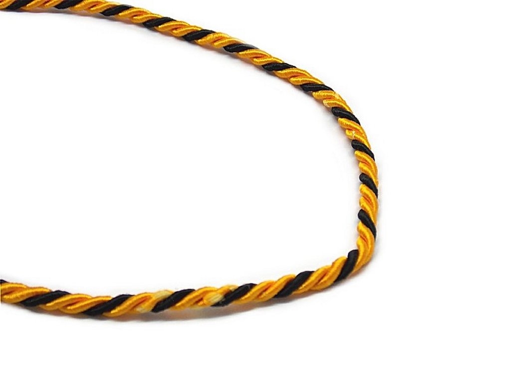 Cordoncino in tessuto lucido intrecciato, con nappina. Lunghezza 40 cm. Diametro 4 mm. Colore giallo e nero. Prodotto in Italia. Peso lordo: 10 grammi.