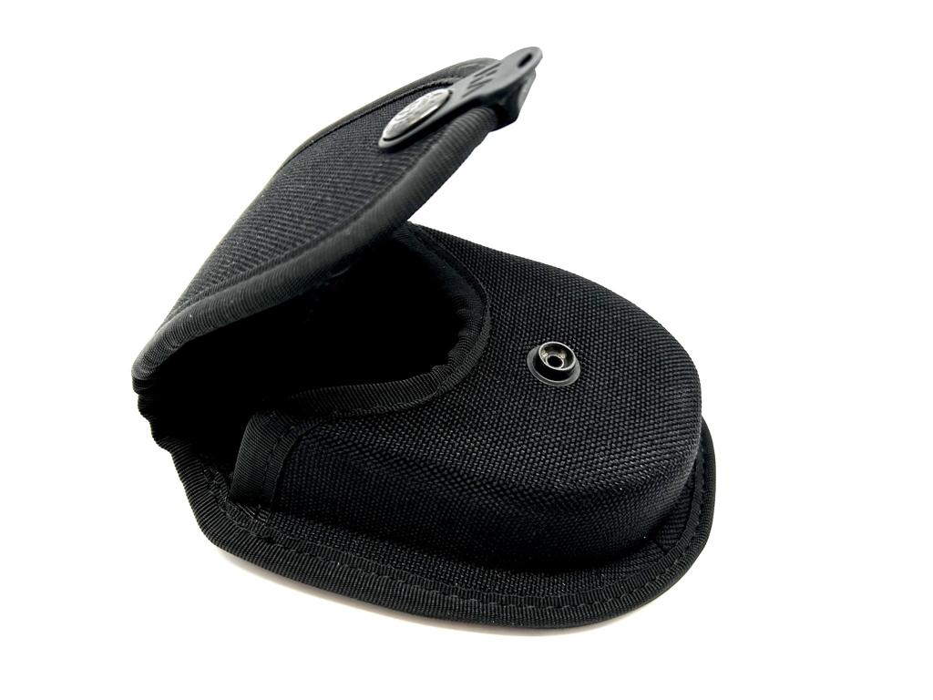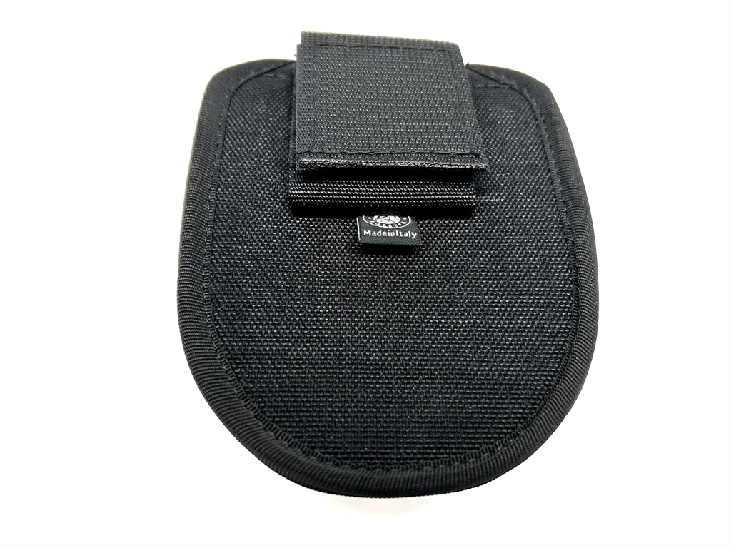 Porta manette chiuso tipo Hyatt/Francia in cordura termoformata. Puntalino in polimero per sgancio rapido e passante in polimero regolabile tramite strip con sistema anti scorrimento. Colore nero. Peso lordo: 85 grammi. Prodotto in Italia.