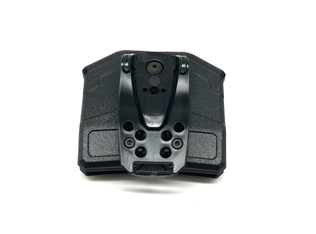 Porta 2 caricatori bifilari, aperto ad estrazione rapida in polimero nero. Con vite di ritenzione. Passante per cinturoni alti 5 cm., regolabile in inclinazione. Completo di passante/paddle. Dimensioni: 10x9,5x2,4 cm. Peso lordo: 125 grammi. Prodotto in Italia.
