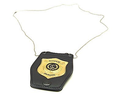 Porta placca in pelle da collo e cintura con placca Guardie Giurate. Dimensioni: lunghezza 11 cm, larghezza 8 cm. Dotato di retro passante in cuoio apribile per cintura. L'acquisto non istituzionale di questo articolo è consentito esclusivamente a coloro che dimostrino la propria Titolare appartenenza a quell'Istituto di Vigilanza, Corpo di Polizia, Ente, Ministero e Associazione che rappresenta il distintivo contenuto in questo prodotto. Ogni abuso o cessione impropria di questo prodotto è considerato reato. Peso lordo: 85 grammi. Prodotto in Italia.
