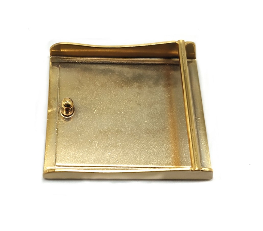 Fibbia a cassetta a singolo piolino in metallo dorato satinato, per cinturoni con altezza 5 cm. Peso lordo: 50 grammi. Larghezza 6,3 cm, altezza 5,3 cm. Con barra tonda sul retro.