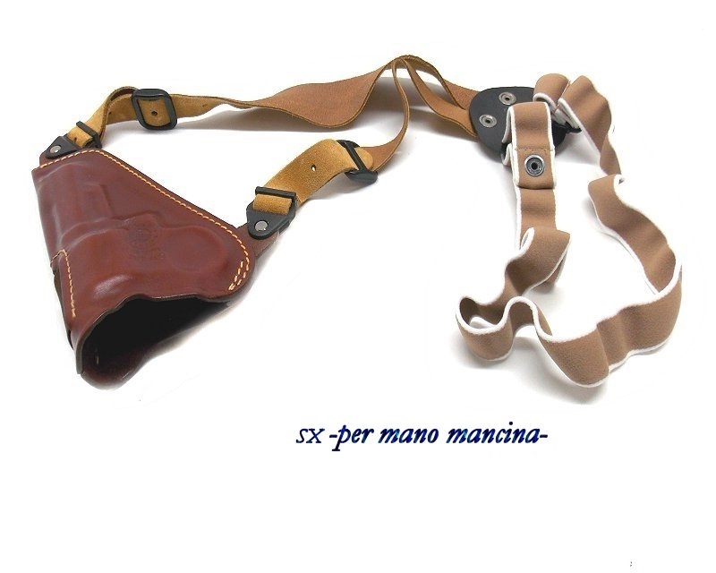 Fondina ascellare aperta capovolta in cuoio con ritenzione ad elastico. Prodotta per colt detective, pyton 2,5, 4 pollici, ruger sp101, s&w 2, 2,5, 4 pollici, Taurus revolver 2 pollici. Colore marrone. Peso lordo: 250 grammi. Prodotto in Italia.