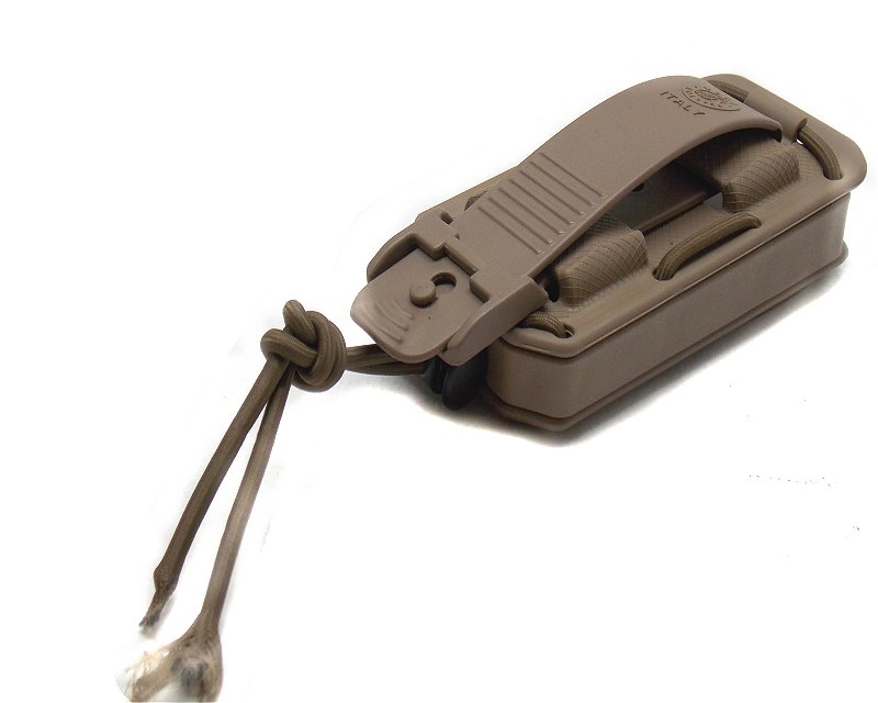 Porta caricatore aperto in polimero gommato. Regolabile tramite elastico tubolare. Si adatta facilmente a tutti i caricatori bifilari presenti sul mercato. Il porta caricatore può montare un sistema molle su un lato o passanti rotativi sull'altro lato. Passante per cinturoni alti fino a 6 cm. Colori disponibili: desert, nero. Dimensioni interne: 9,5x3,5x1,8 cm. Peso lordo: 75 grammi. Prodotto in Italia.