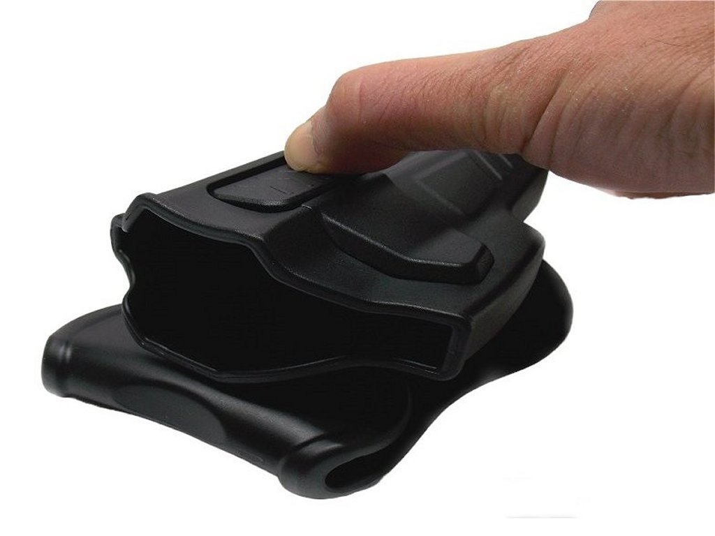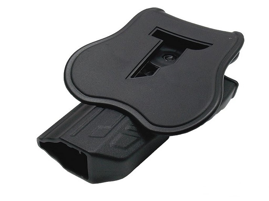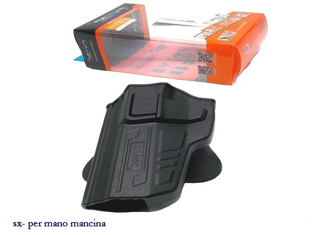 La fondina in polimero nero di alta qualita ruota a 360 gradi. La posizione si regola con l'inclinazione attraverso l'impiego della chiave a brugola in dotazione. Con paddle standard. Il meccanismo a pulsante consente di custodire l'arma in modo sicuro e contemporaneamente ne permette, se azionato, un'estrazione rapida. Disponibile: destra, sinistra. Peso: 175 grammi. Peso lordo: 230 grammi.