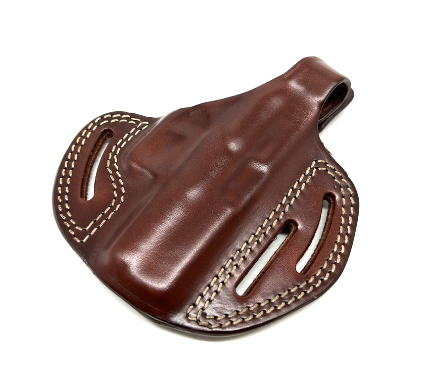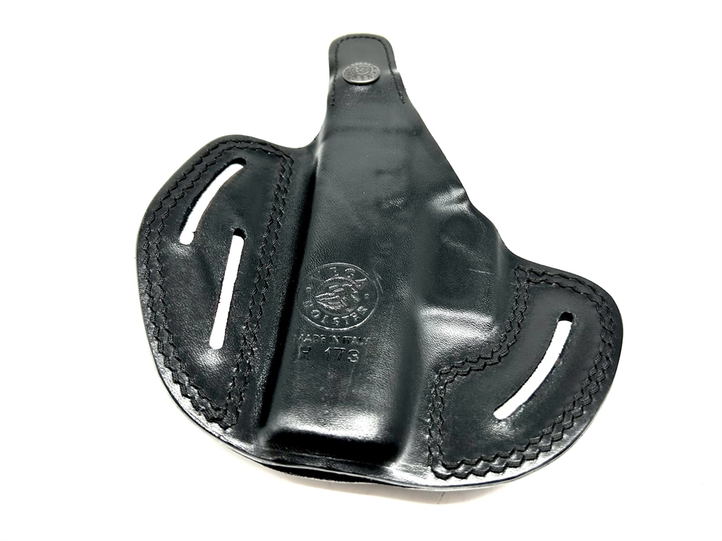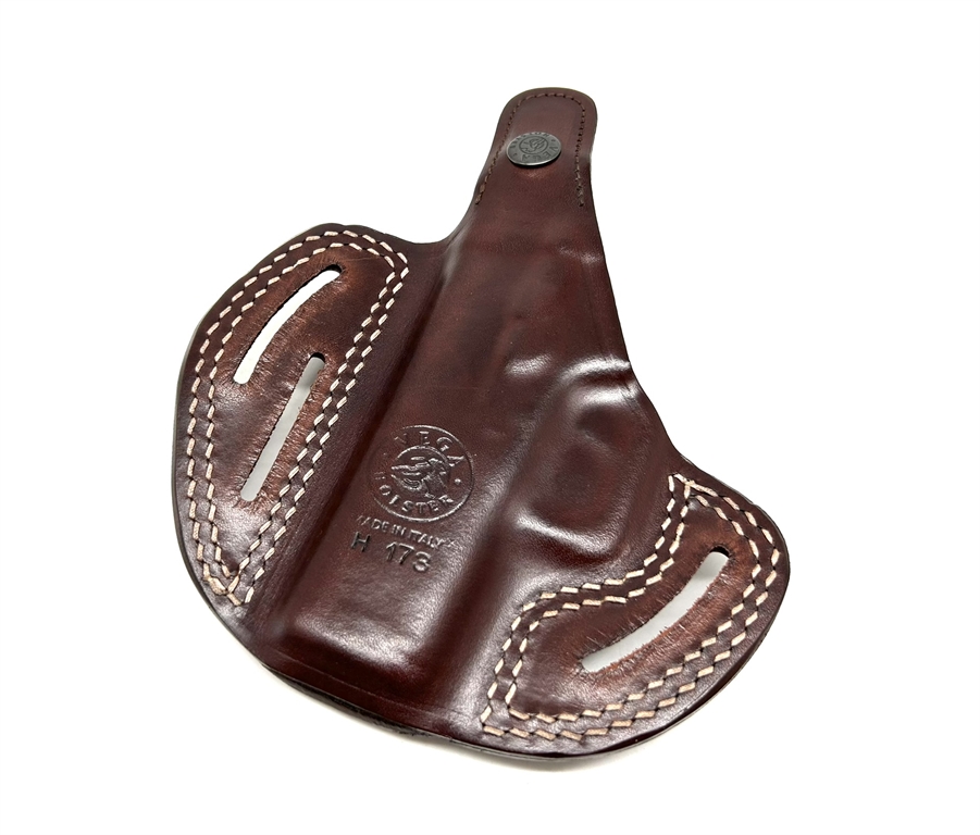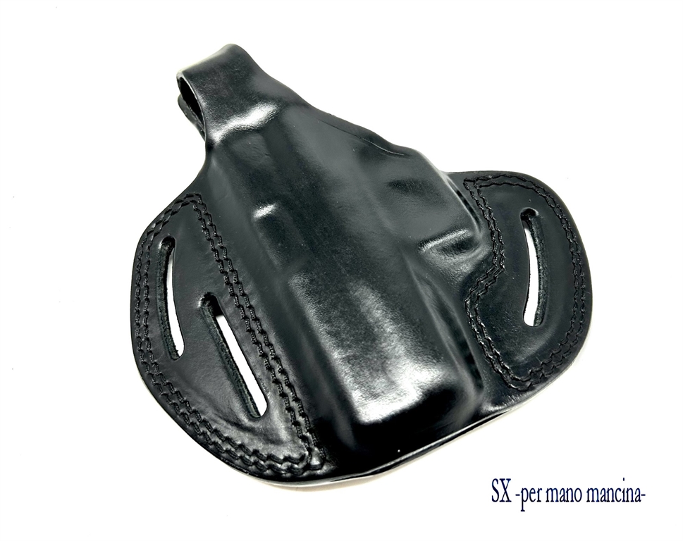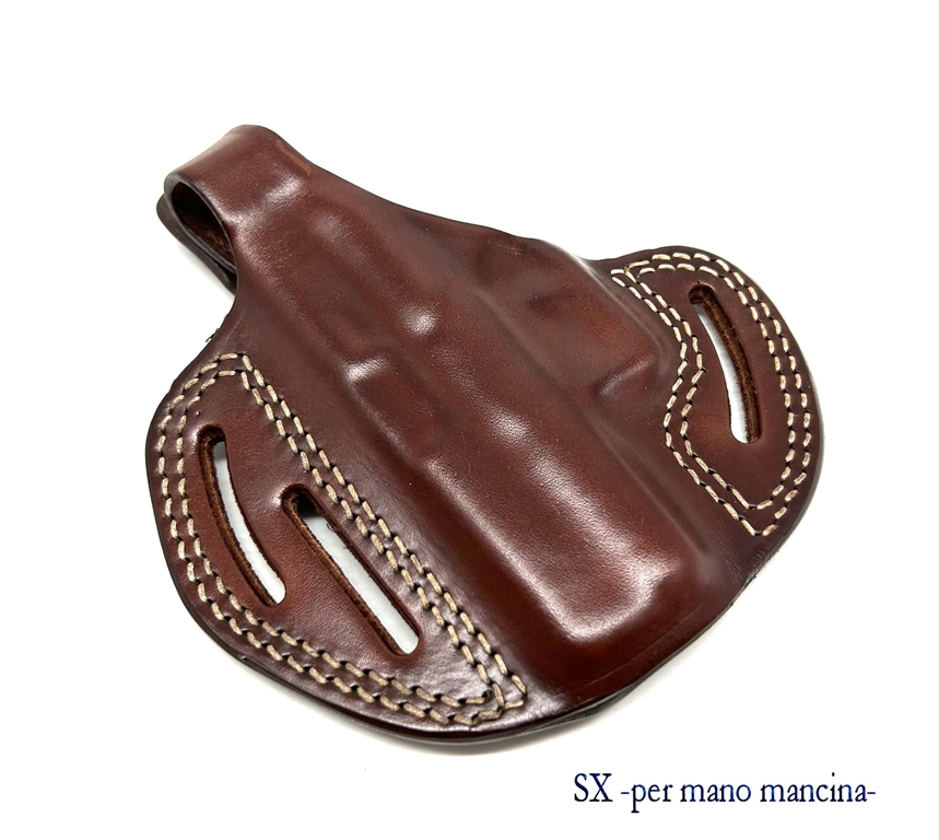 Fondina da cintura in cuoio con sgancio rapido, 3 asole che consentono una diversa inclinazione. Prodotta nei colori nero o marrone, per vari tipi di pistole e revolver come: Beretta 92, 98, 84, 8000, px4 storm, 90 two, 98 A1, Beretta apx, bersa thunder 9, glock 17, 19, 20, 21, 22, 31, 37, 43,caracal c, caracal f, colt 1911, hk usp, hk usp compact, spriengfield xd, walther ppk, ppq, p99, p99q, revolver da 2, 3 e 4 pollici, e altri modelli. Altezza ideale della cintura per poter essere adattata al meglio la fondina è di 4 cm. Peso lordo: 115 grammi. Prodotto in Italia.