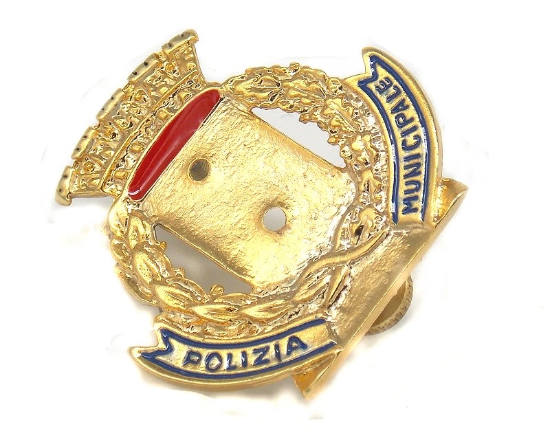 Porta fregio in metallo dorato. Dimensioni esterne: lunghezza 4,58 cm, larghezza 4,5 cm. Distanza tra le due viti 2,7 cm. Con scritta Polizia Municipale. Con 2 viti. Peso lordo:15 grammi