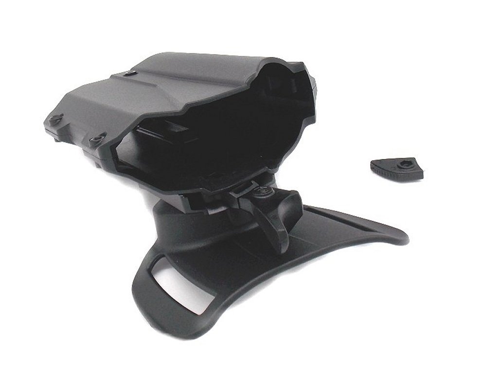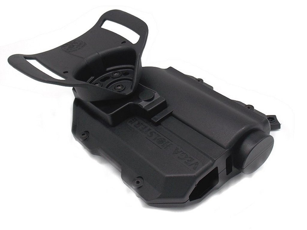 Fondina in polimero nero con porta torcia/laser e con sistema sicurezza superiore. Passanti per cinture alte 5,5 cm. Per Beretta 92/98 e large auto compact. Disponibile sola destra. Peso lordo: 425 grammi. Prodotto in Italia.
