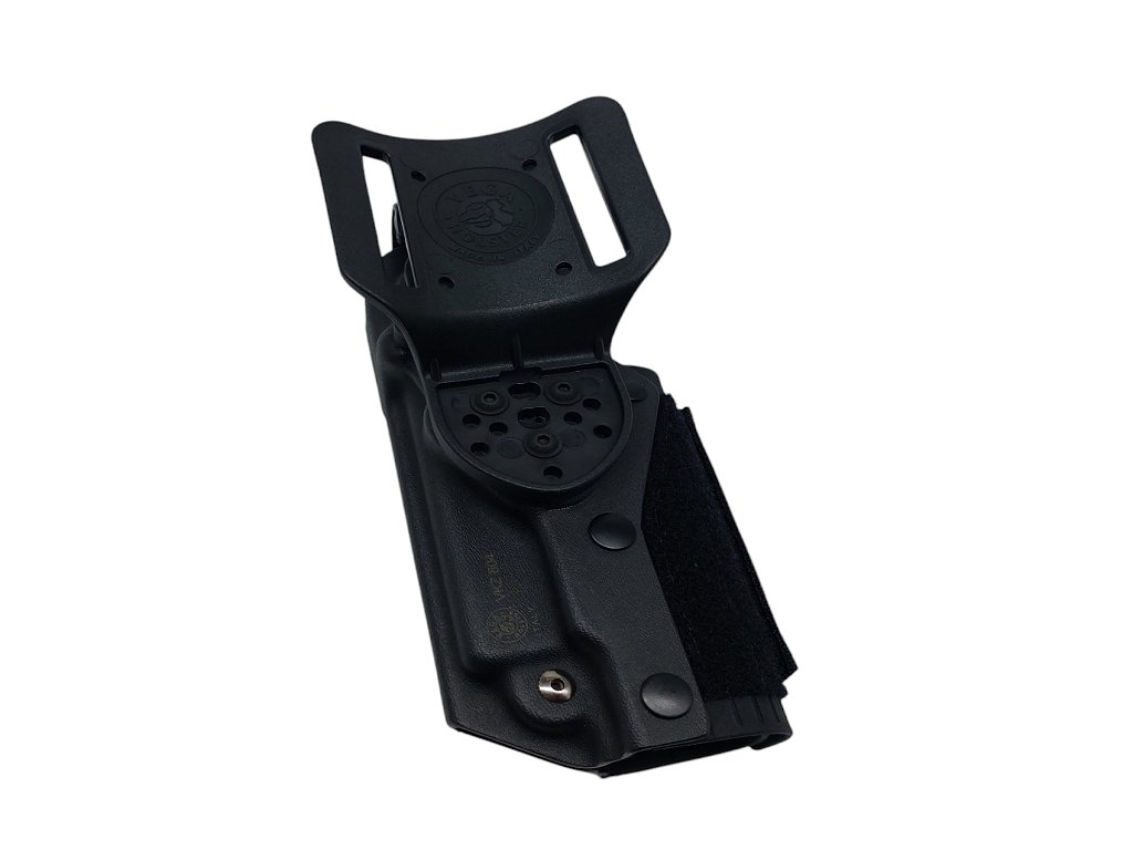 Fondina in polimero termoformato per armi con torcia tattica o laser. Il sistema di sicurezza è del tipo a laccio rotativo. La parte posteriore della fondina, in coincidenza con il ponticello dell'arma, è formata da due parti in gomma e cordura, ed è regolabile secondo la tipologia di luce tattica/o laser inserita sull'arma. La fondina presenta una vite per la regolazione della ritenzione inferiore sull'arma. Colore nero. Destra. Peso lordo: 370 grammi. Prodotto in Italia.