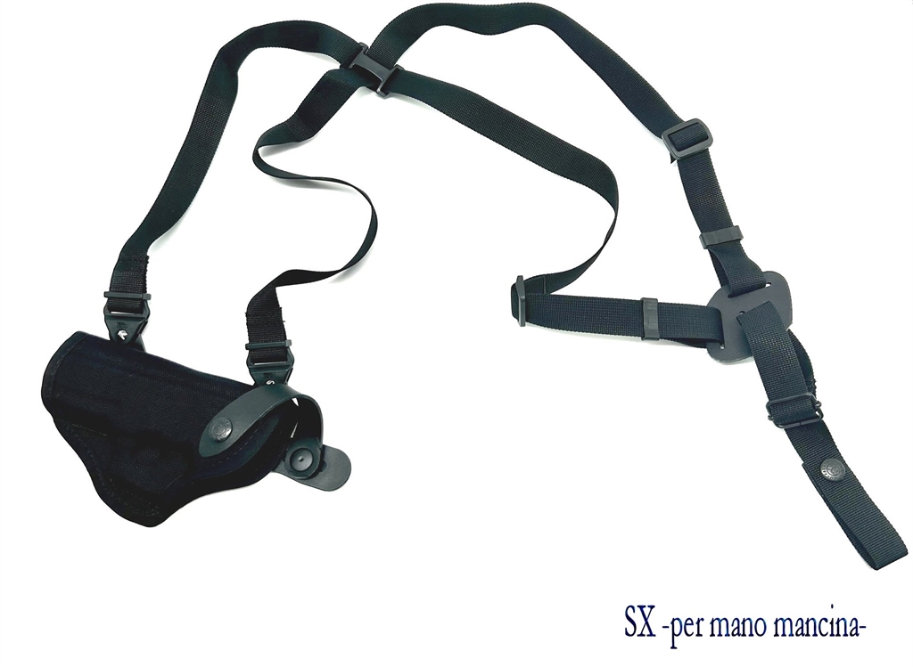 Fondina ascellare doppio uso, ascellare orizzontale o da cintura in cordura balistica. Asole per cinture alte 4 cm. Prodotta per large auto, beretta 92, 98, beretta apx, glock 17, 19, 20, 22, 23, 25, 26, 27, 32, 38, colt 1911, beretta px4, walter p99, revolver 2, 2,5 e 4 pollici. Peso lordo: 220 grammi. Prodotto in Italia.