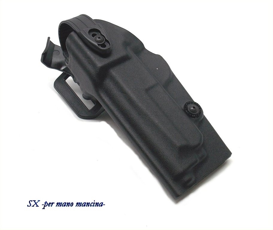 Fondina in polimero stampato a iniezione di grado di sicurezza III, adatta uso professionale in divisa o tattico.Il sistema di sicurezza è garantito dalla combinazione dei meccanismi Vega Push Down e Vega Automatic Push and Go, che lavorano simultaneamente per offrire la massima sicurezza a operatore e, allo stesso tempo, consentire una rapida estrazione con un solo movimento in caso di necessità.La stabilità dell arma in fondina è garantita da una vite di ritenzione regolabile.La fondina può essere montata su tutti i passanti e kit Vega Holster. Disponibile: destra, sinistra. Passanti per cinturoni alti 5,5 cm. Colori disponibili nero o bianco.Prodotta per i seguenti modelli: beretta 92, 98, 98A1, 90two, px4 storm, beretta apx, beretta apx compact, caracal c, caracal f, colt 1911 ,colt pyton 4 pollici, glock 17, 18, 19, 23, 25, 267, 27, 28, 32, 38, hk usp, sig sauer p 220, 226, pro 2022, taurus pt92,tanfoglio force 921r old e new generation, walther ppq, p99q, p99, piexon jpx. Prodotto in Italia.