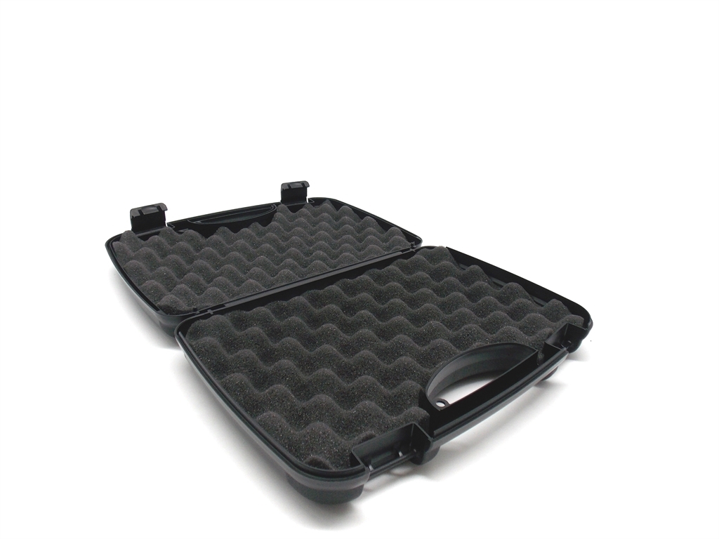 Valigetta in plastica nera porta pistola. Dimensioni: 305x185x64 mm. Con spugna interna. Con maniglia per il trasporto. Chiusura con due clip in plastica. Peso lordo: 385 grammi. Prodotto in Italia.