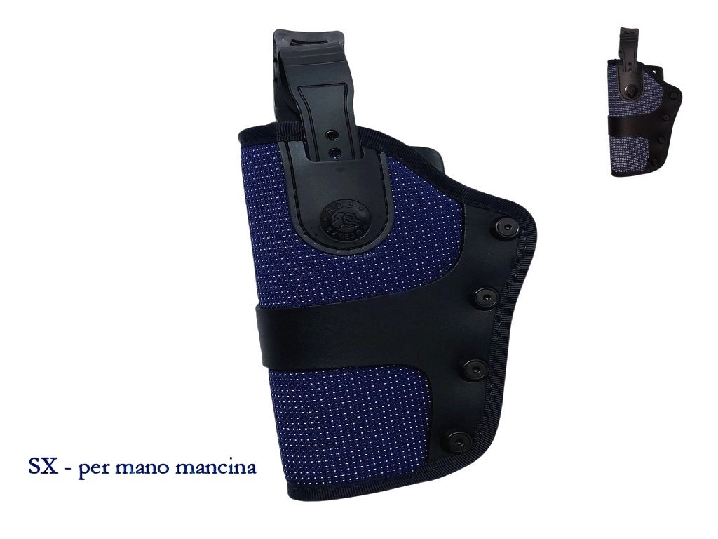 Fondina alta visibiltà in colore blu, con inserti rifrangenti direttamente inseriti nella trama del tessuto in cordura, e che permettono un alta visibilità in ambiente notturno mantenendo il colore blu totale del prodotto in ambito diurno, con sistema di sgancio rapido con sicura regolabile ed amovibile. Supporto in polimero che mantiene la giusta distanza dal corpo. Prodotta per le seguenti armi: beretta apx, beretta 92, 98, 84, px4 storm, px4 storm sub compact, 90 two, 98 A1, 8000, cz 75, 85, 83, glock 17, 19, 20, walther p99, ppq, p99q, taurus g3, revolver 4 pollici. Le asole del passante sono per cinturoni alti 5 cm. Prodotto in Italia. Peso lordo: 290 grammi.