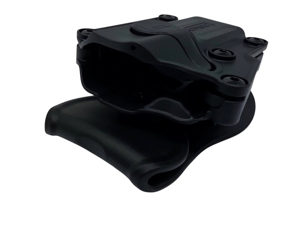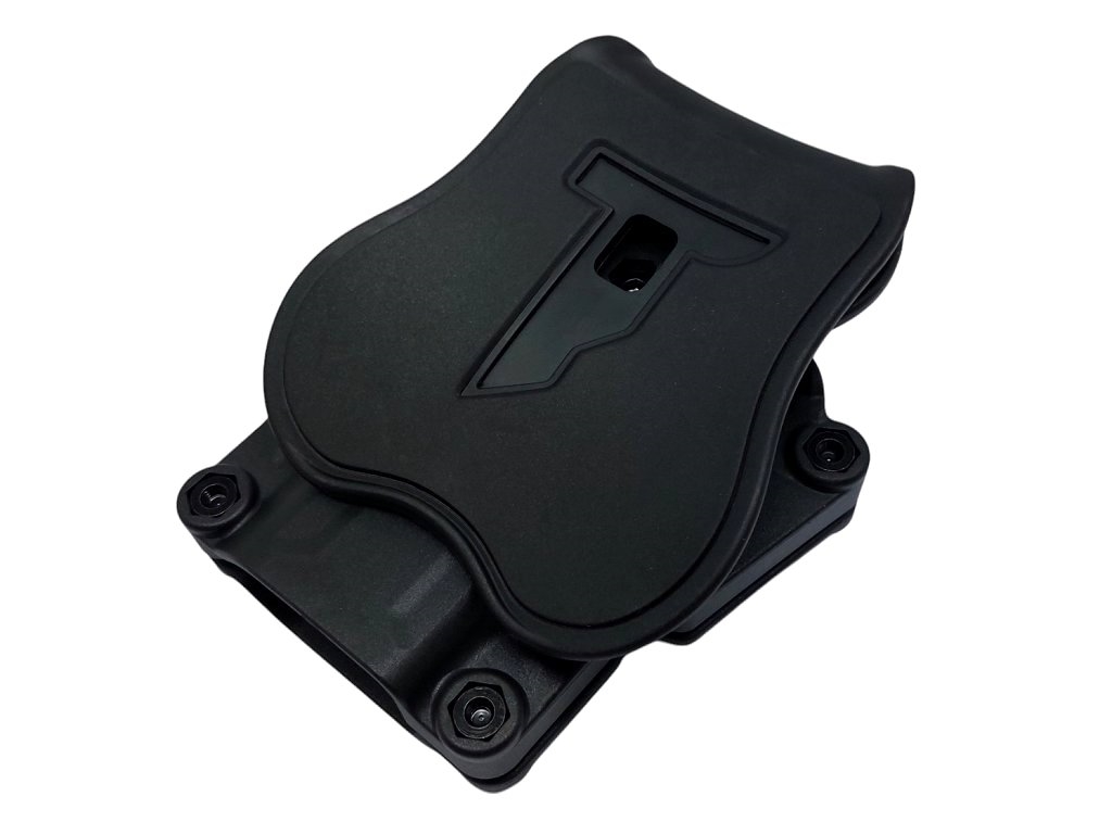 Fondina in polimero nero universale adattabile a: Glock, Beretta, Sig Sauer, Taurus, ecc. Disponibile destra. Passante per cinturone a molla. Con canna scoperta. Prodotto in Cina. Peso lordo: 255 grammi.