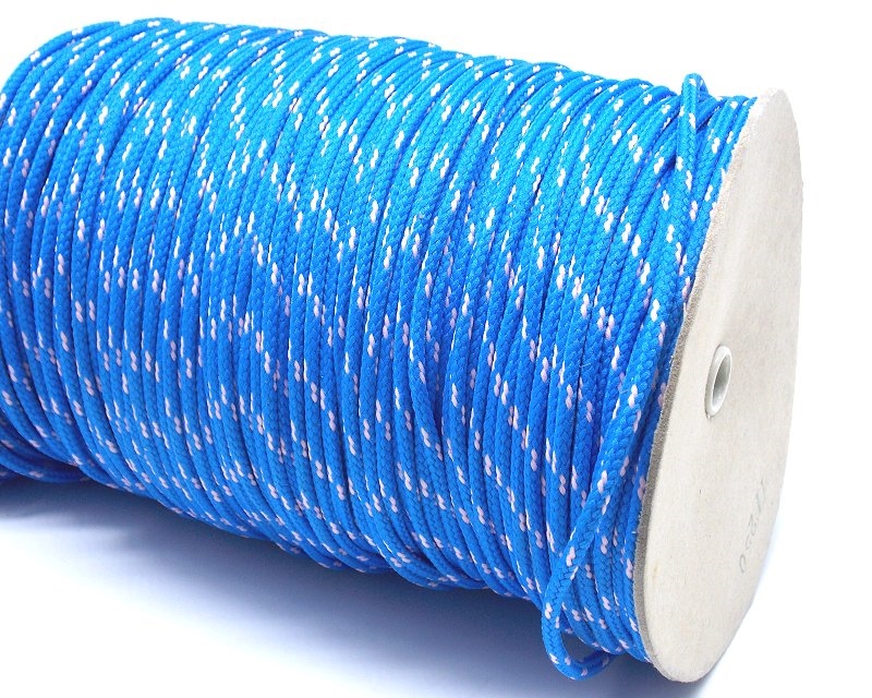 Corda in tessuto di colore blu e rosa. Diametro 4 mm. Adatta per svariati usi. Vendita al metro. Peso lordo: 10 grammi.