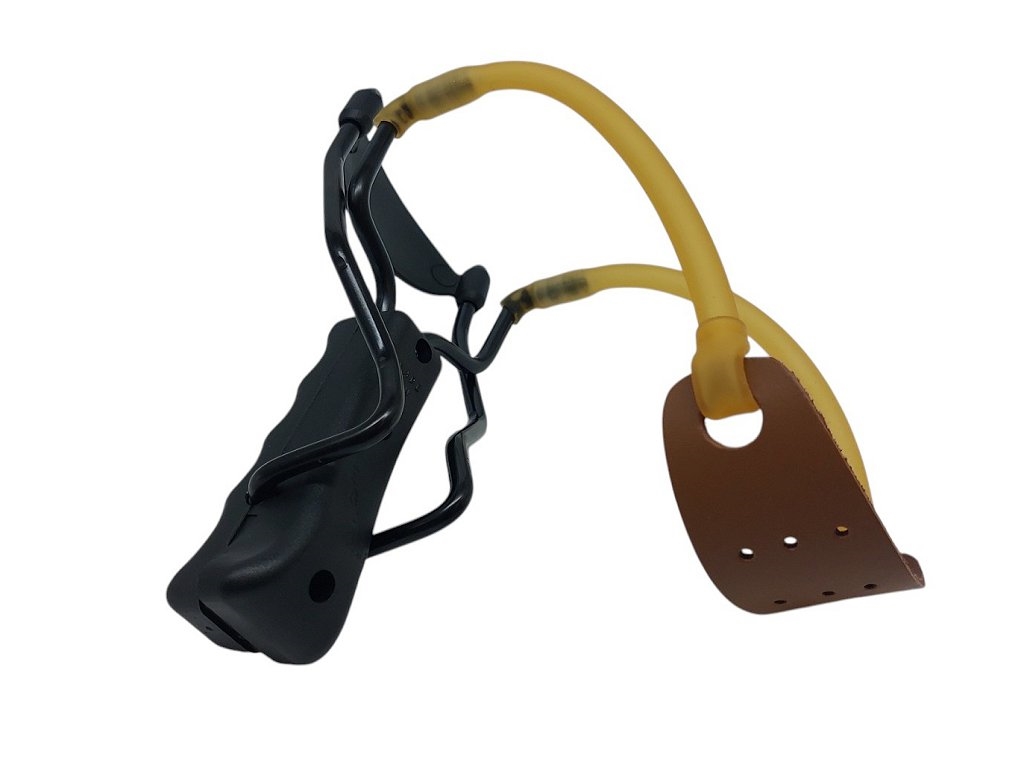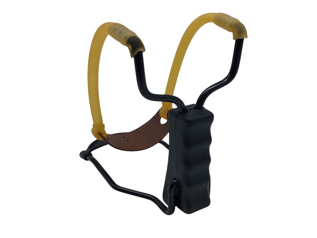 Fionda con impugnatura anatomica in abs. Forcella di tensione in metallo plastificato antiruggine. Elastici in puro lattice, poggia sfere in pelle antiscivolo. Misure: - altezza 17 cm - larghezza totale forcella 9,3 cm - spessore max manico 2 cm - lunghezza totale elastico in posizione di riposo 47 cm. - altezza alloggiamento sassi 3,5 cm Dotata di appoggia braccio in metallo e plastica chiudibile lungo 14 cm, e largo 8 cm. Prodotto in Italia. Peso lordo: 290 grammi.